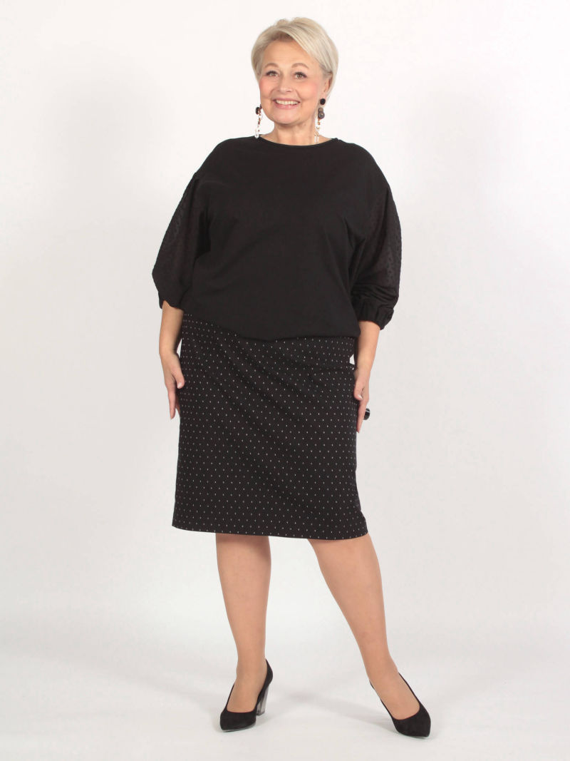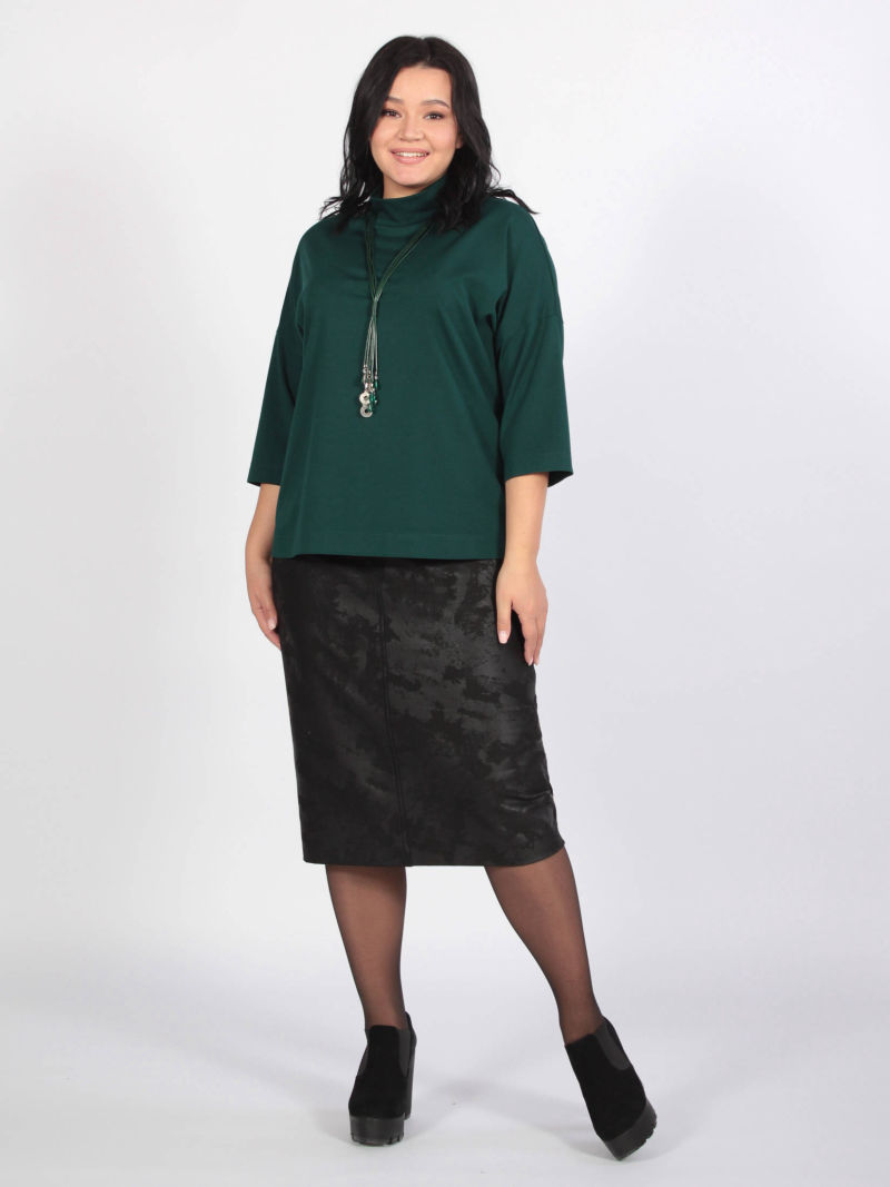 Юбка из трикотажа с тиснением под кожу. Мы искали именно такую ткань, чтобы модное изделие было удобным. В юбке мы сделали довольно много рельефных швов с отделочными строчками, чтобы юбка была максимально стильной и современной. А ещё вертикальные отделочные строчки вытягивают силуэт, что тоже немаловажно. Пояс у юбки на резинке, юбка без застёжки, только имитация застёжки и карманов. Это сделано сознательно, чтобы карманы и застёжка не топорщились, потому что в трикотаже это бывает, а нам хотелось бы добиться максимально красивого облегания. РЕКОМЕНДУЕМ выбирать размер по мерке обхвата бёдер, в поясе резинка, поэтому по талии юбка подойдёт.