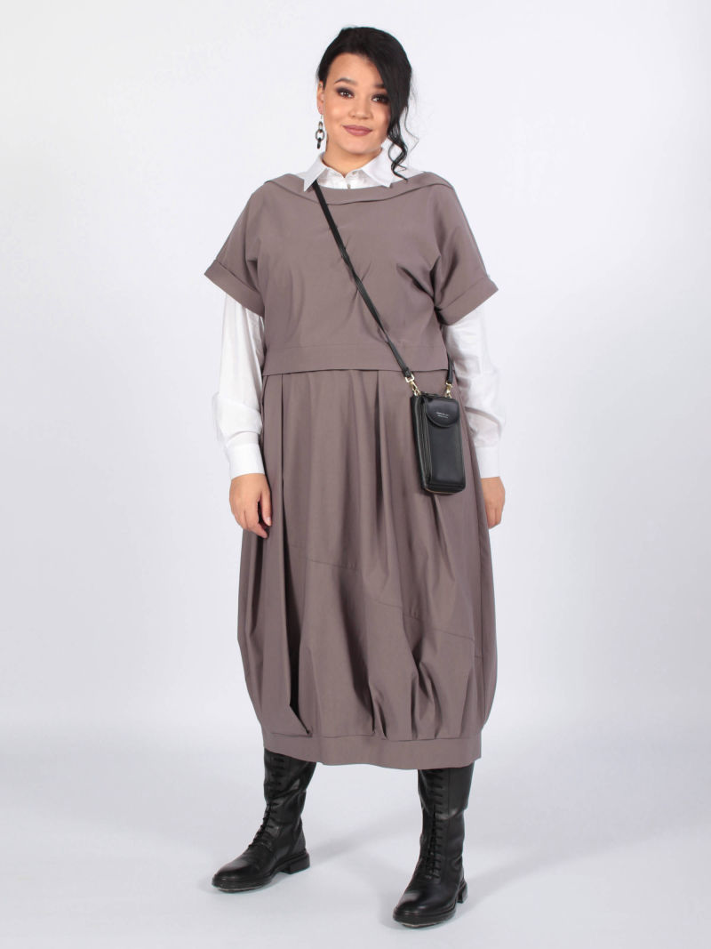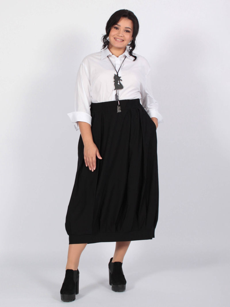 Юбка-миди бочкообразной формы из смесовой ткани с эластаном. Глубокие складки у пояса и защипы по низу изделия формируют силуэт и создают манящую игру свето-тени. Эластичная притачная планка по низу юбки фиксирует объем и дисциплинирует образ. Юбка с широким притачным поясом на эластичной резинке, в боковых швах выполнены удобные карманы. Наша юбка хорошо комплектуется с жилетом артикул 97963946; блузками, рубашками. Для создания образа могут подойти такие модели: жилет арт. 103613794, блузка арт. 97948024, арт. 75586566