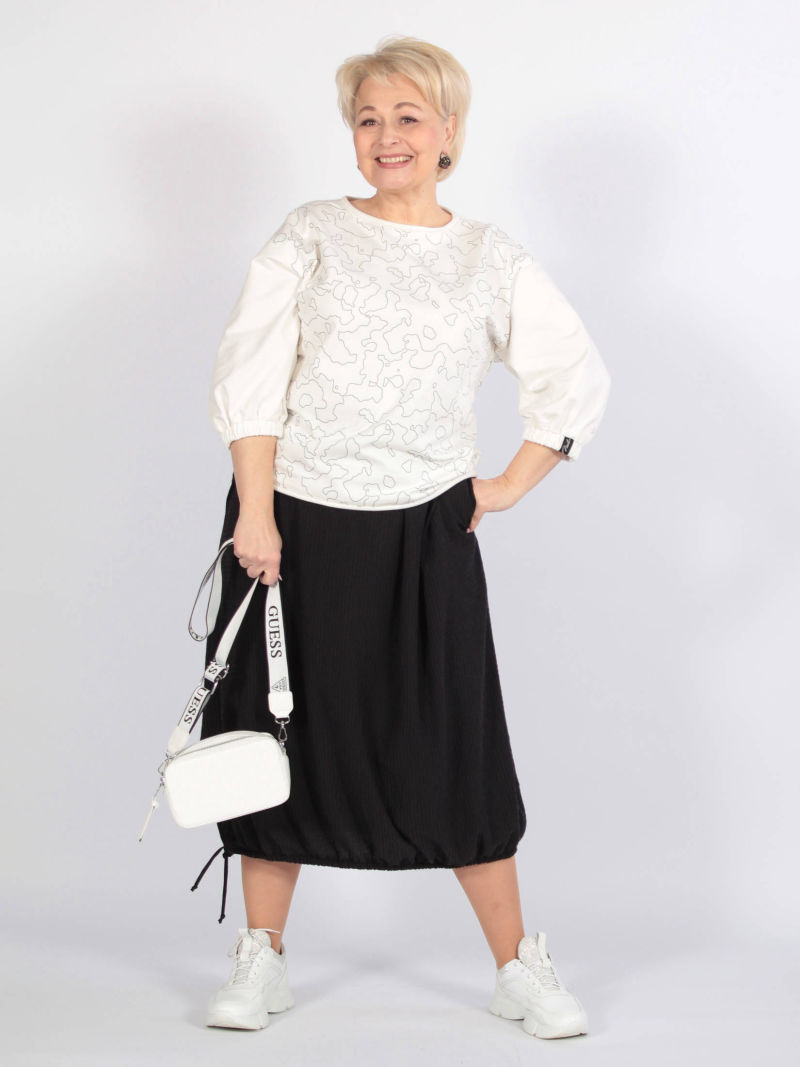 Длина юбки - 79 см. Представляем вам юбку, которая станет идеальным выбором для каждой женщины, включая тех, кто предпочитает плюс сайз. Эта юбка - настоящий шедевр белорусской женской одежды, созданный для всех, кто ищет повседневную, классическую и офисную одежду высшего качества. Вы можете надеть ее на работу в офис, на встречу с подругами, в университет или на вечеринку. Изготовленная из мягкого приятного к телу смесового материала, с жатой фактурой. Юбка имеет свободный оверсайз фасон, который позволяет свободно двигаться и чувствовать себя комфортно в любой ситуации. Притачной трикотажный пояс с эластичной резинкой обеспечивает комфортную посадку по талии, а карманы вдоль боковых швов добавляют удобства. Дополнительным акцентом выступает дугообразный разрез справа и трикотажный жгут, переходящий в произвольные шнурки-завязки, что придает этой юбке дерзкий и сексуальный вид.