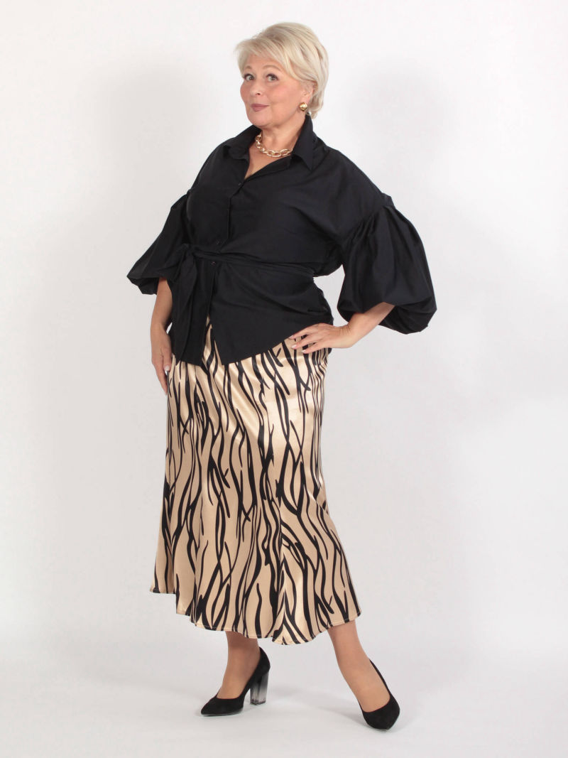 Длина изделия по спинке - 84 см. Юбка атласного стиля, наполненная роскошью и элегантностью. Изготовлена из плотной вискозной ткани, которая обладает уникальным атласным мерцанием. Широкий расширенный силуэт в форме буквы "А" в сочетании с фактурой материала создает нежные пластичные фалды у ног, придавая движениям женственность и грацию. Атласная ткань обладает благородным блеском, добавляя образу роскоши. Великолепный животный принт в стиле зебры подчеркивает современный модный взгляд. Удобный притачной пояс на резинке обеспечивает идеальную посадку. Если вы ищете юбку, которая обращает на себя внимание и при этом выражает женственную грацию, эта модель несомненно привлечет вас своим роскошным дизайном и утонченной элегантностью. Наш бренд Надин предлагает белорусский трикотаж и одежду больших размеров для полных женщин. Одной из особенностей нашего ассортимента является наличие oversize моделей для девушек, которые пользуются популярностью в модном мире. Наша белорусская одежда подходит для любого сезона - весеннего, осеннего, летнего и зимнего.