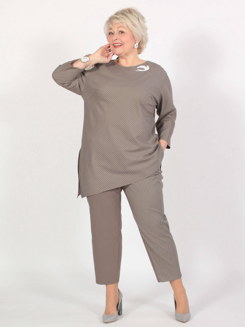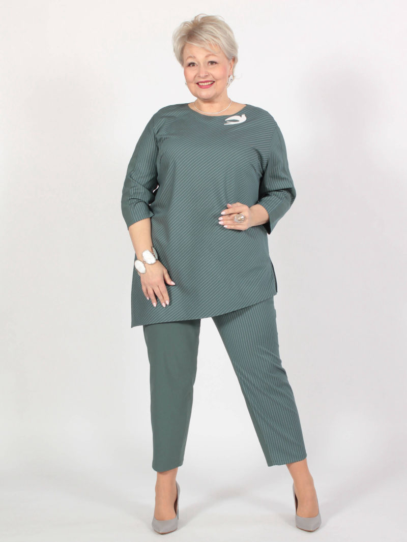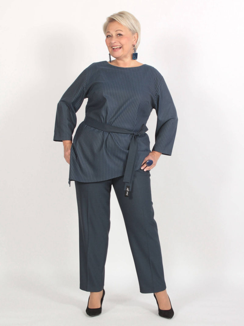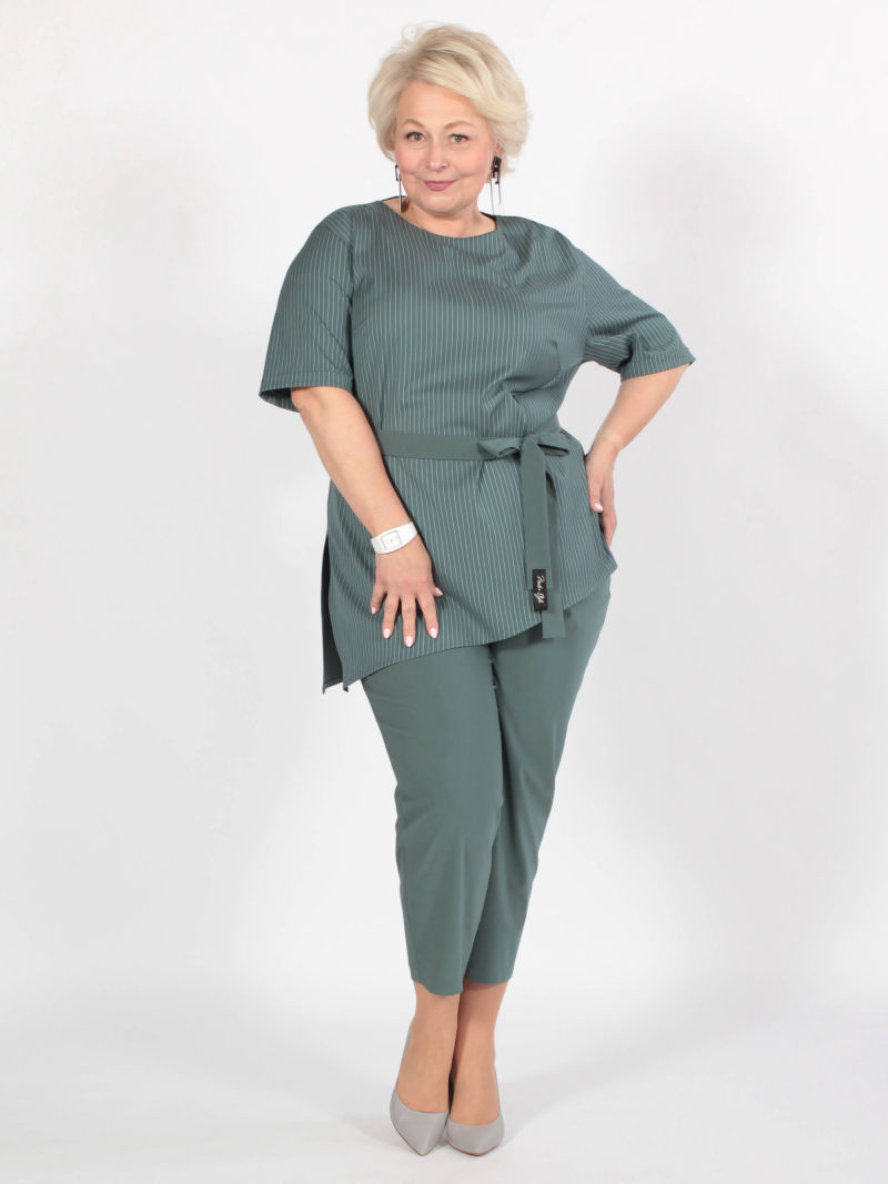 Удобный и стильный женский брючный костюм . Идеально сядет на любую фигуру больших размеров. Женский брючный деловой костюм выполнен из костюмной смесовой ткани с эластаном. Удлиненная женская туника с нарочито косым низом и разрезом сбоку придает динамику и формирует характер модель и подчеркнет все ваши достоинства и скроют недостатки! Сочетание узкой полоски и гладко-крашенного материала визуально стройнит и вытягивает фигуру. Горловина округлой формы-лодочка, линия плеча слегка спущена. Рукав прямой длиной 3/4 зауженный к низу. Туника дополнена отделочным поясом, декорированным фирменной лентой. Пояс фиксируется в произвольный мягкий бант и подчеркивает талию. Стильный костюм соответствует всем требованиям дресс—кода, обеспечивает уют и комфорт в движении. Брюки зауженного к низу силуэта и удобным притачным поясом на эластичной резинке, благодаря чему сядет на любую фигуру.