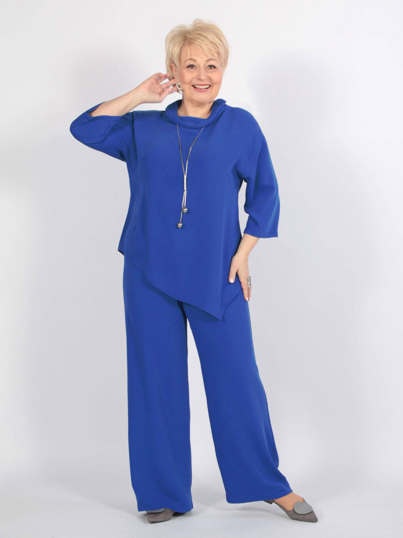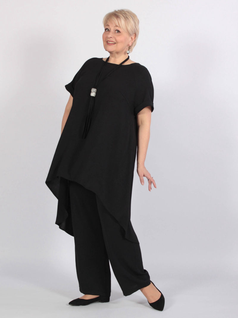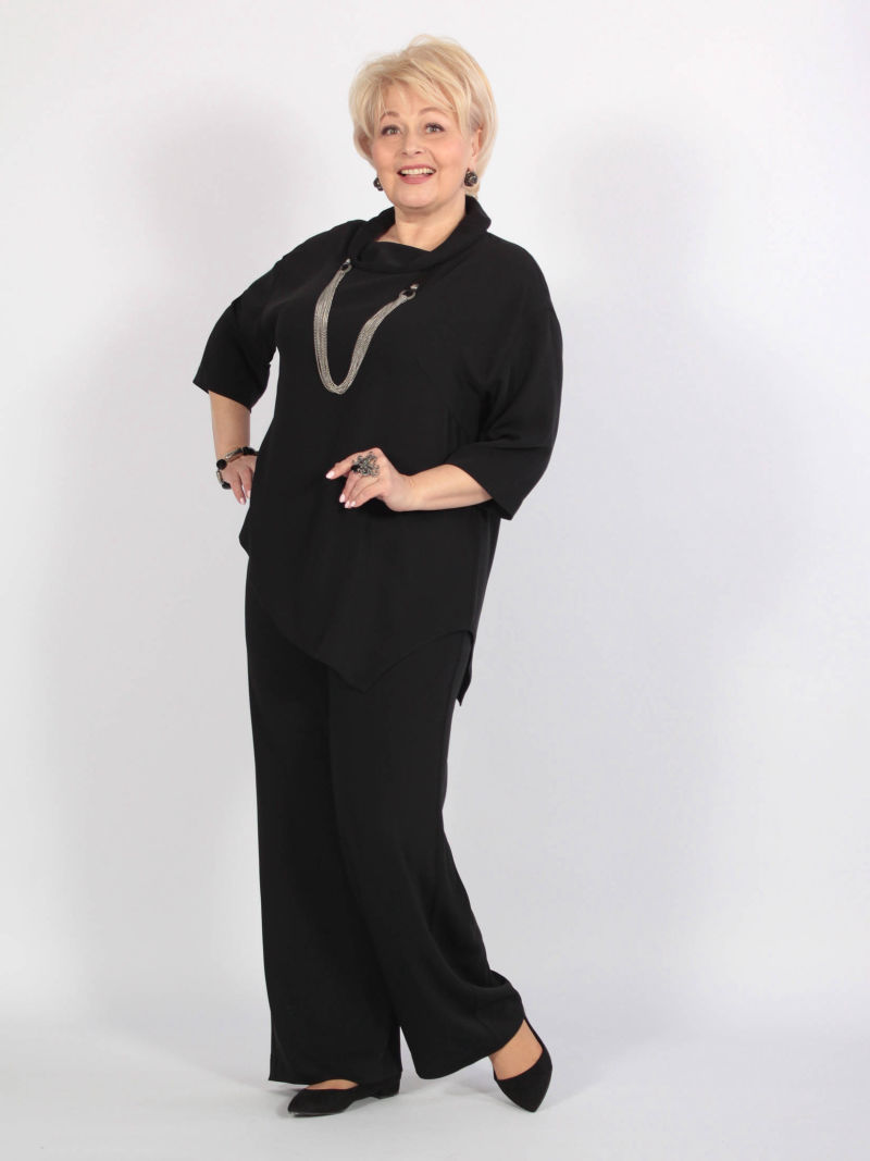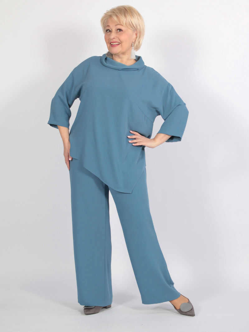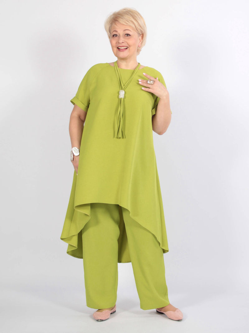 Длина туники по спинке - 115см, длина переда по середине от горловины до низа 72см, длина рукава - 33см. Длина брюк по внутреннему шву - 74.5 см, длина брюк внизу - 25 см. Брючный костюм, состоящий из удлиненной туники и брюк свободного кроя . Туника свободного А-образного силуэта с асимметричным низом, который формирует мягкие фалды по низу, ткань струится, подчеркивает изгибы фигуры и двигается в такт вашей походке. Горловина округлой формы-лодочка. Рукав-реглан короткий с манжетой по низу, плавная обтекаемая линия плеча обеспечивает комфорт и удобство. Брюки прямого кроя с удобными карманами вдоль боковых швов и притачным поясом на эластичной резинке. Завершающим дополнением образа являются бусы-лассо декорированные двумя крупными кольцами и длинной кисточкой. Наш костюм удачно подчеркивает достоинства, визуально вытягивает и стройнит фигуру.