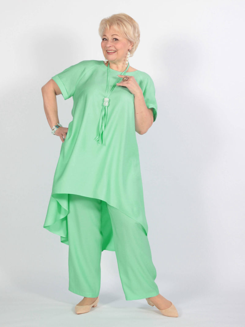 Длина туники по спинке - 115см, длина переда по середине от горловины до низа 72см, длина рукава - 33см. Длина брюк по внутреннему шву - 74.5 см, длина брюк внизу - 25 см. Летний брючный костюм, состоящий из удлиненной туники и брюк свободного кроя . Туника свободного А-образного силуэта с асимметричным низом, который формирует мягкие фалды по низу, ткань струится, подчеркивает изгибы фигуры и двигается в такт вашей походке. Горловина округлой формы-лодочка. Рукав-реглан короткий с манжетой по низу, плавная обтекаемая линия плеча обеспечивает комфорт и удобство. Брюки прямого кроя с удобными карманами вдоль боковых швов и притачным поясом на эластичной резинке. Завершающим дополнением образа являются бусы-лассо декорированные двумя крупными кольцами и длинной кисточкой. Наш брючный костюм удачно подчеркивает достоинства, визуально вытягивает и стройнит фигуру.