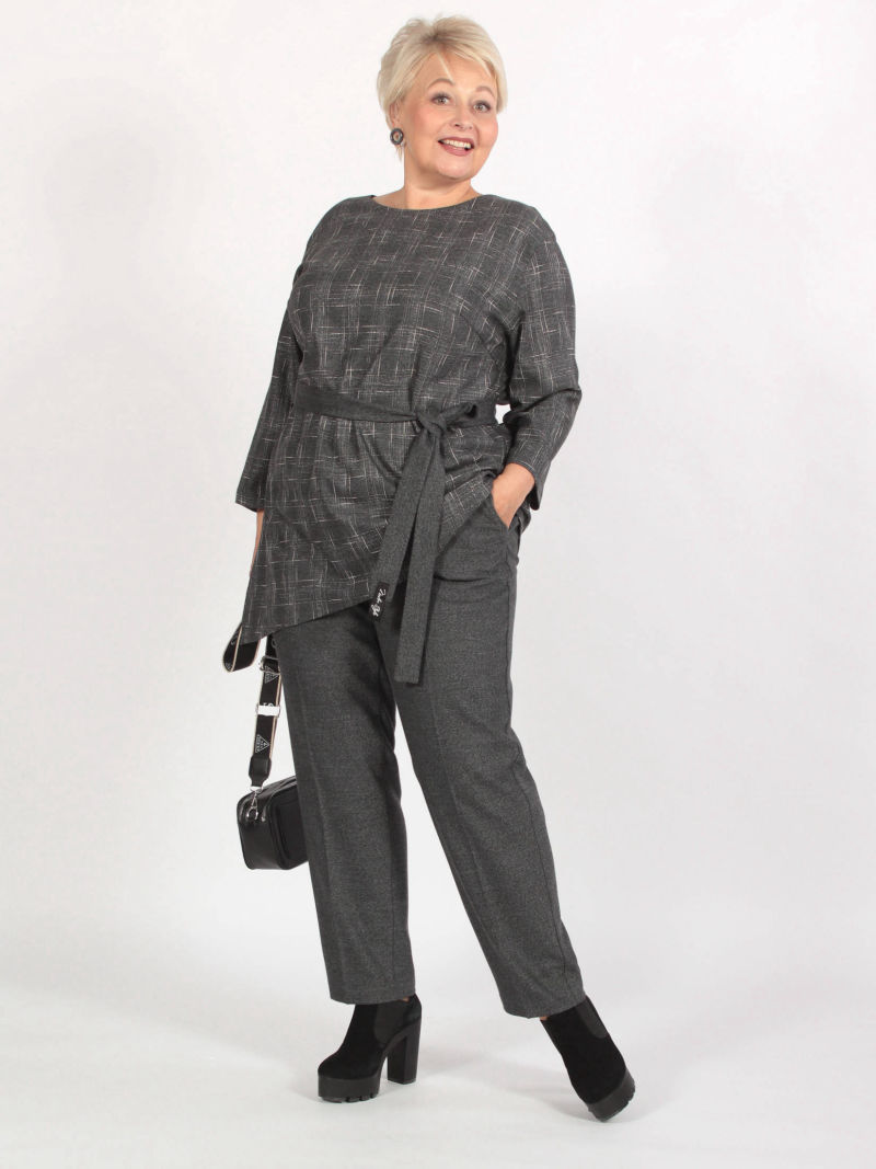 Длина туники по спинке - 78 см , длина рукава с плечом - 61 см , длина брюк по боковому шву - 100 см, длина брюк по внутреннему шву - 74 см, ширина брюк внизу - 20 см. Брючный костюм из приятной смесовой ткани с эластаном. Сочетание комбинированных тканей, полоски и однотона, создан стильный и современный образ. Удлиненная туника с нарочито косым низом и разрезом сбоку придает динамику и формирует характер модели. Горловина округлой формы-лодочка, линия плеча слегка спущена. Рукав прямой, длиной 3/4, зауженный к низу. Туника дополнена отделочным съёмным пояском, декорированным фирменной лентой. Пояс произвольно фиксируется в мягкий бант и подчеркивает талию. Брюки зауженного силуэта и манжетой по низу с удобным притачным поясом на эластичной резинке. Спереди выполнены функциональные карманы с косым горизонтальным входом.