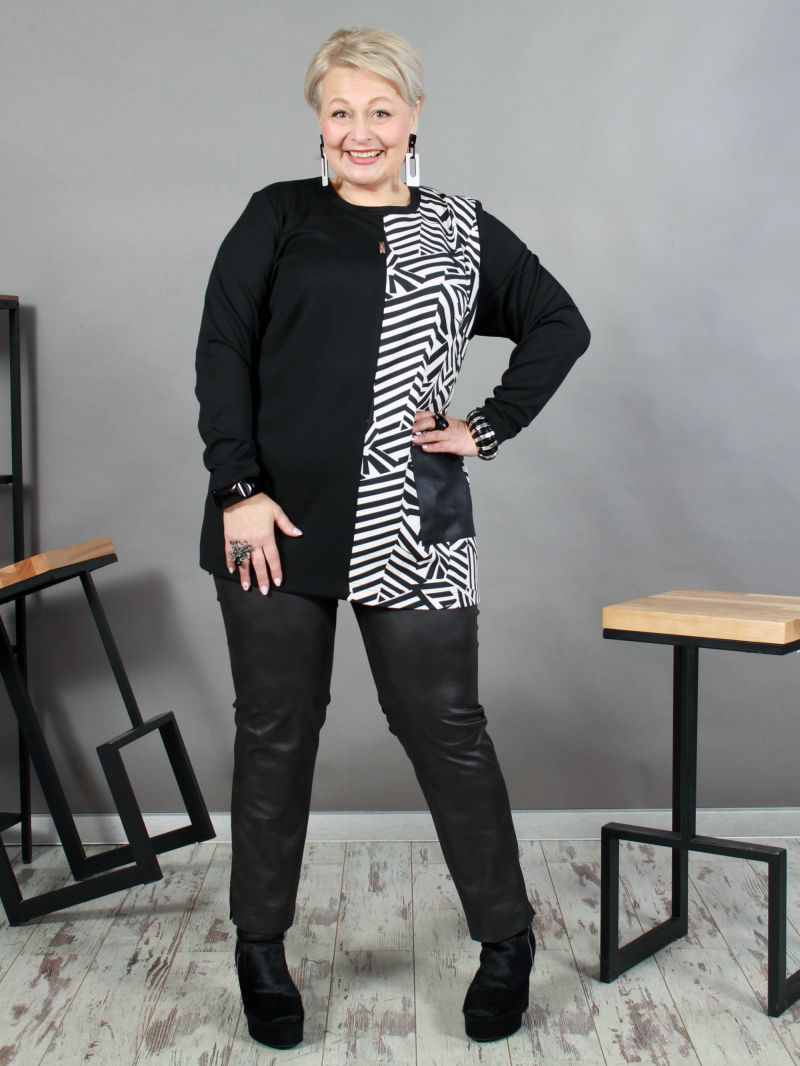 Эффектная туника прямого силуэта из качественного трикотажа. Она зрительно стройнит за счёт вертикального деления изделия. Выигрышный геометрический рисунок и накладной карман из кожзама сразу обращают на себя внимание. В поддержку этим ярко выраженным акцентам, мы обработали горловину изделия обтачкой из кожзама, карман дополнили молнией. Универсальная вещь на все случаи жизни. Отлично смотрится как с классическими брюками, так и с джинсами черного цвета.