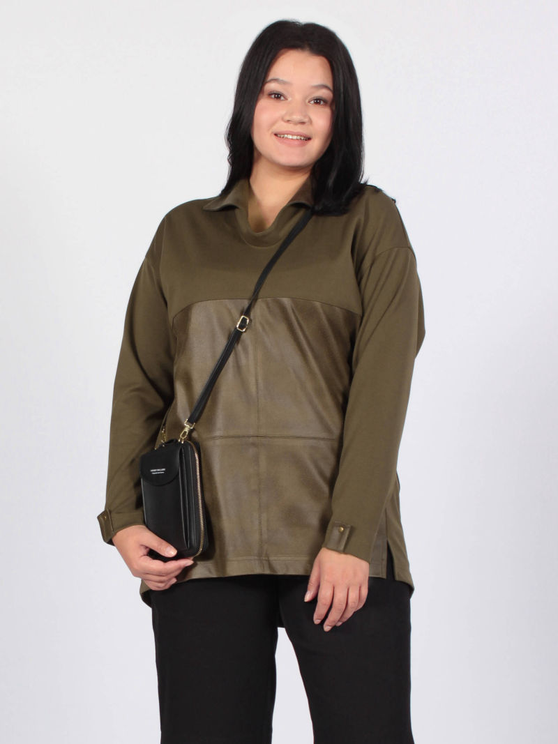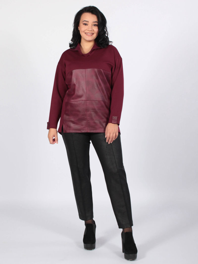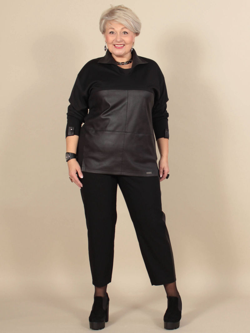 Сочетание кожзама и трикотажа - один из трендов этого сезона. Эта модель аналог артикула 4866564, отзывы можно посмотреть там. Туника прямого силуэта . нижняя часть переда и воротник выполнены из мягкого, приятного трикотажа под кожу. У туники спущенное плечо, что даёт свободу движения. Для создания образа могут подойти такие модели: брюки женские арт. 79590875, арт. 102276119, капри арт. 48431222. Параметры наших моделей: блондинки - 56р, 112-94-120; брюнетки - 52р, 104-85-112.