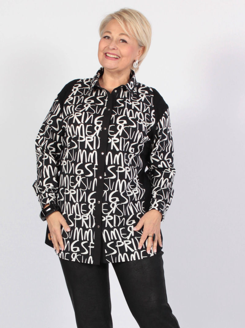Туника выполнена из натурального текстиля со стрейтчем. Застежка на кнопки, воротник стояче-отложной. Перед декорирован отделочной тесьмой с логотипом. Рукава 7/8 также декорированы тесьмой. В боковых швах разрезы, низ фигурной формы. Plus size/плюс сайз/большие размеры/для полных женщин/надин оверсайз для девушек/белорусская одежда женская/Беларусь/офисное женское Белоруссия/oversize/турецкая ткань/туника/кофта/лонгслив/блузка укороченная/туника/для подростка школа/для девочки школьная/спортивный.