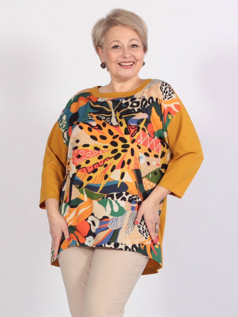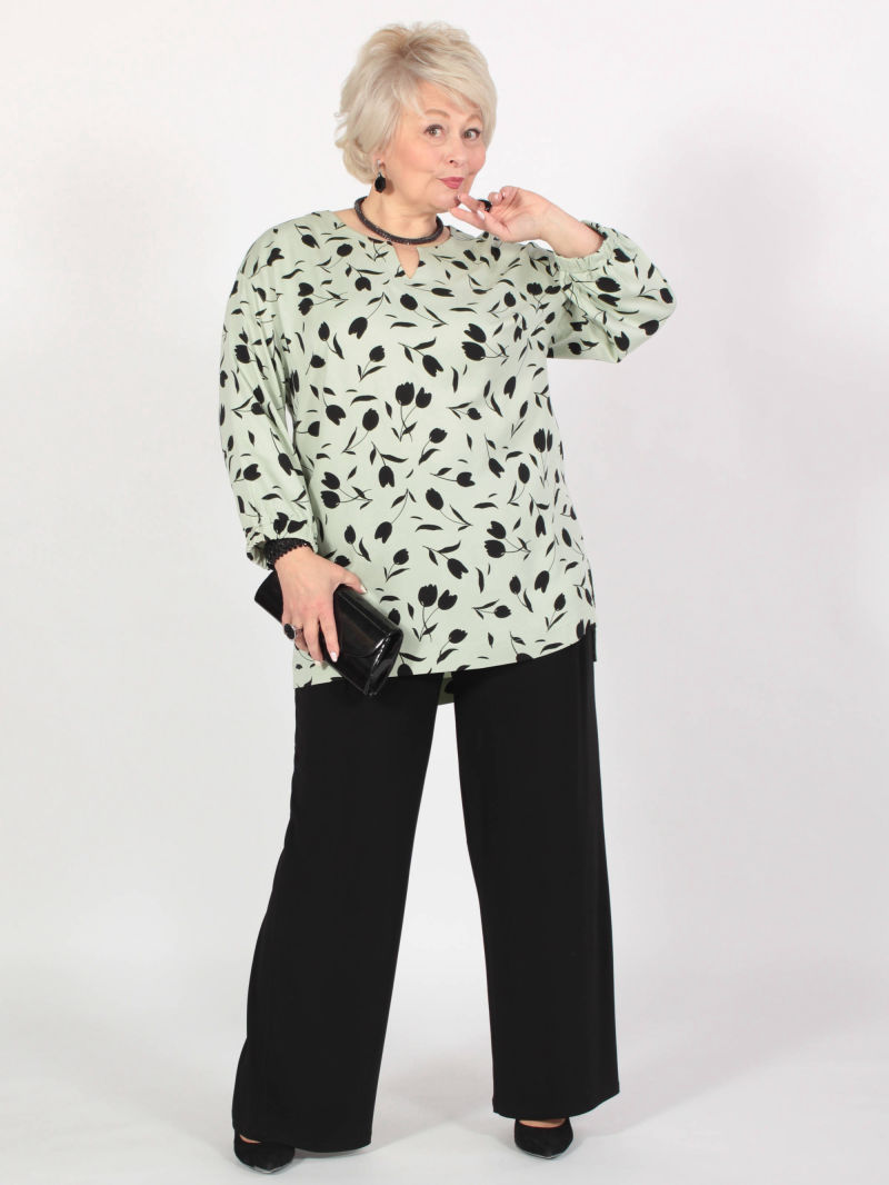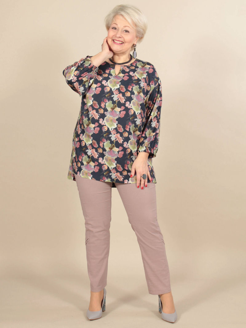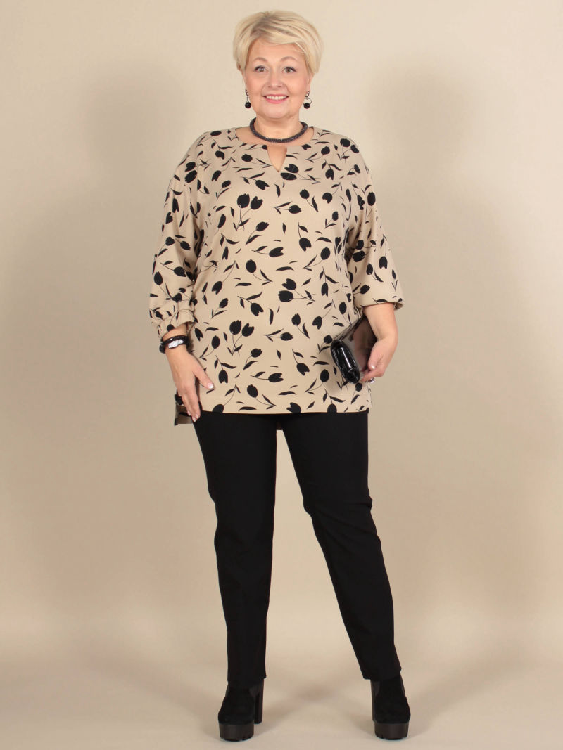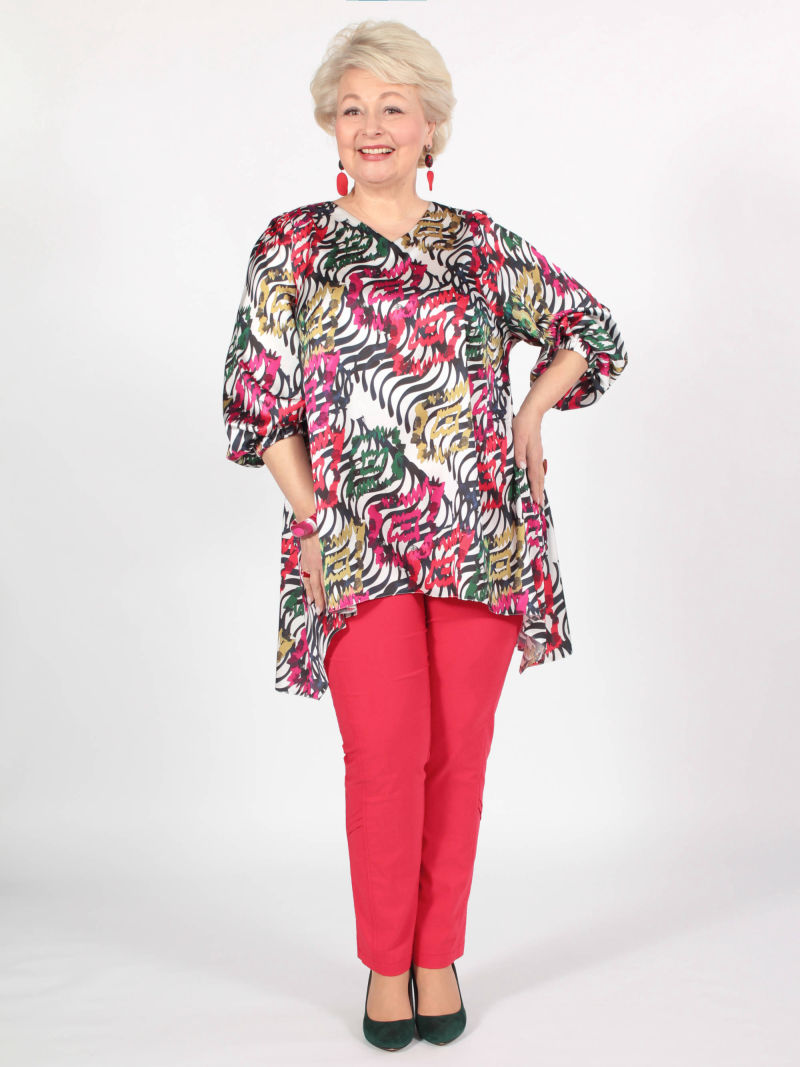 Идеальный принт это большая редкость. И нам пришлось потрудиться, чтобы найти такой для нашей туники. Блузка свободная, удлиненная, со спущенным плечом и оригинальным вырезом горловины. Рукава объёмные, на резинке, есть разрезы по боковым швам. Для создания образа могут подойти такие модели брюк: арт. 21367288, арт. 65086098, арт. 67000755, арт. 41266718, арт. 70459436