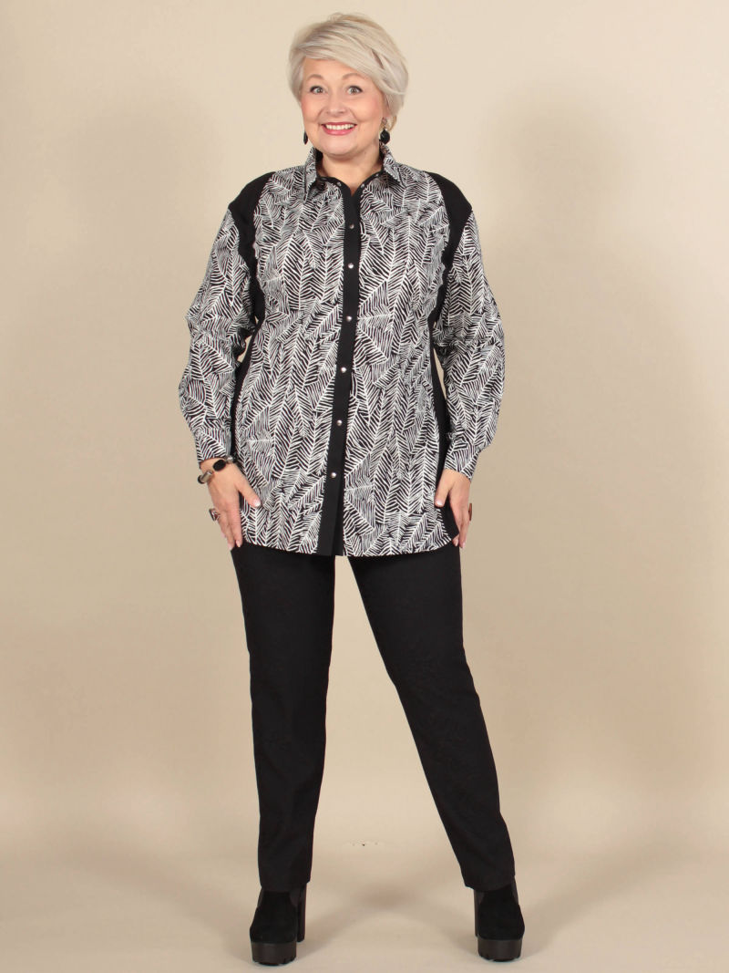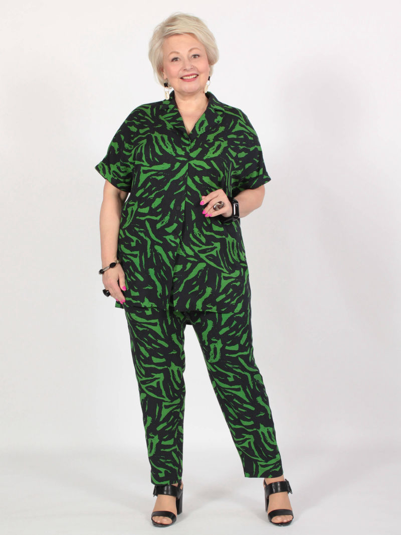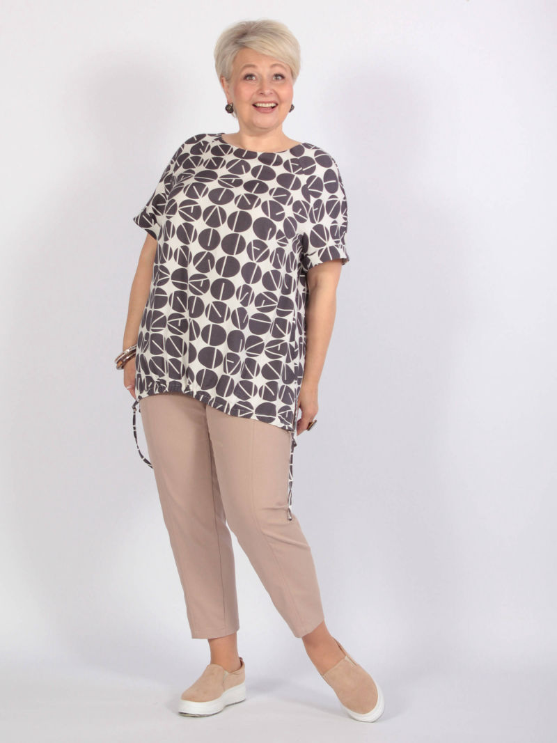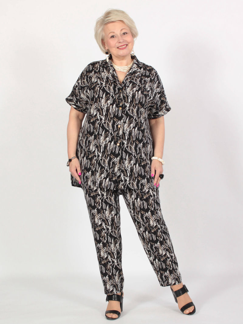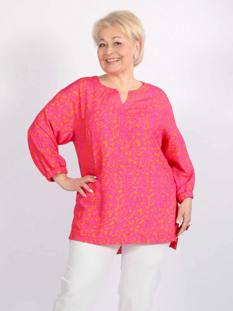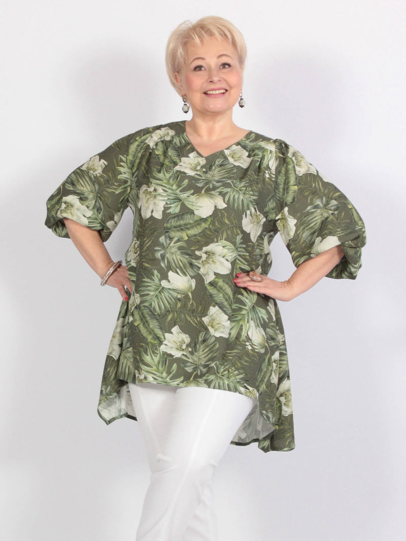 Идеальный принт это большая редкость. И нам пришлось потрудиться, чтобы найти такой для нашей туники. Блузка свободная, удлиненная, со спущенным плечом и оригинальным вырезом горловины. Рукава объёмные, на резинке, есть разрезы по боковым швам. Для создания образа могут подойти такие модели брюк: арт. 21367288, арт. 65086098, арт. 67000755, арт. 41266718, арт. 70459436