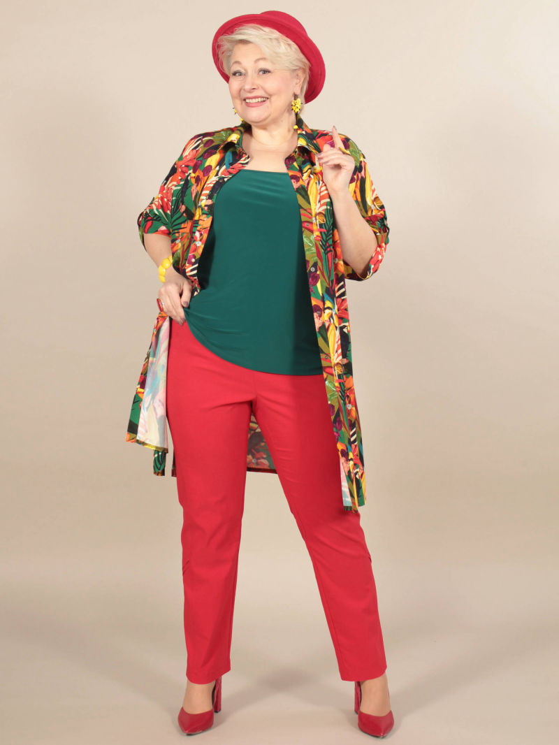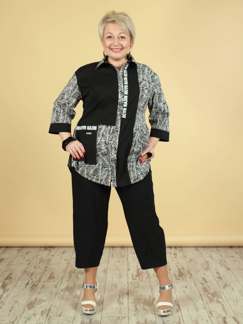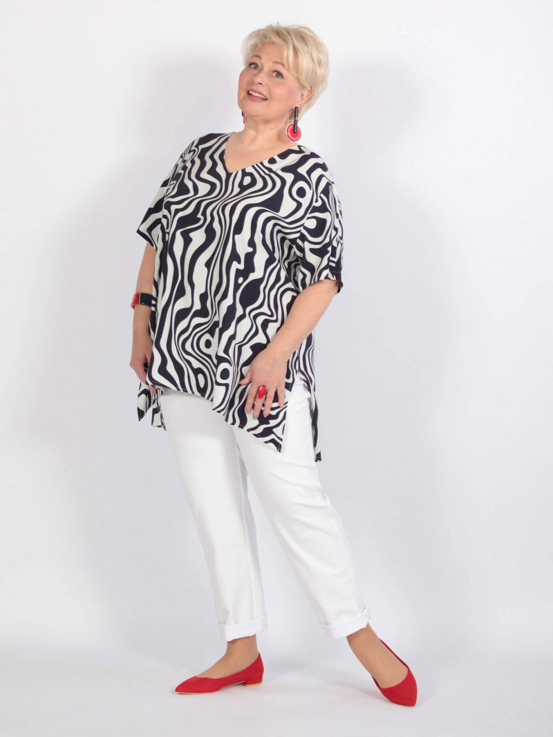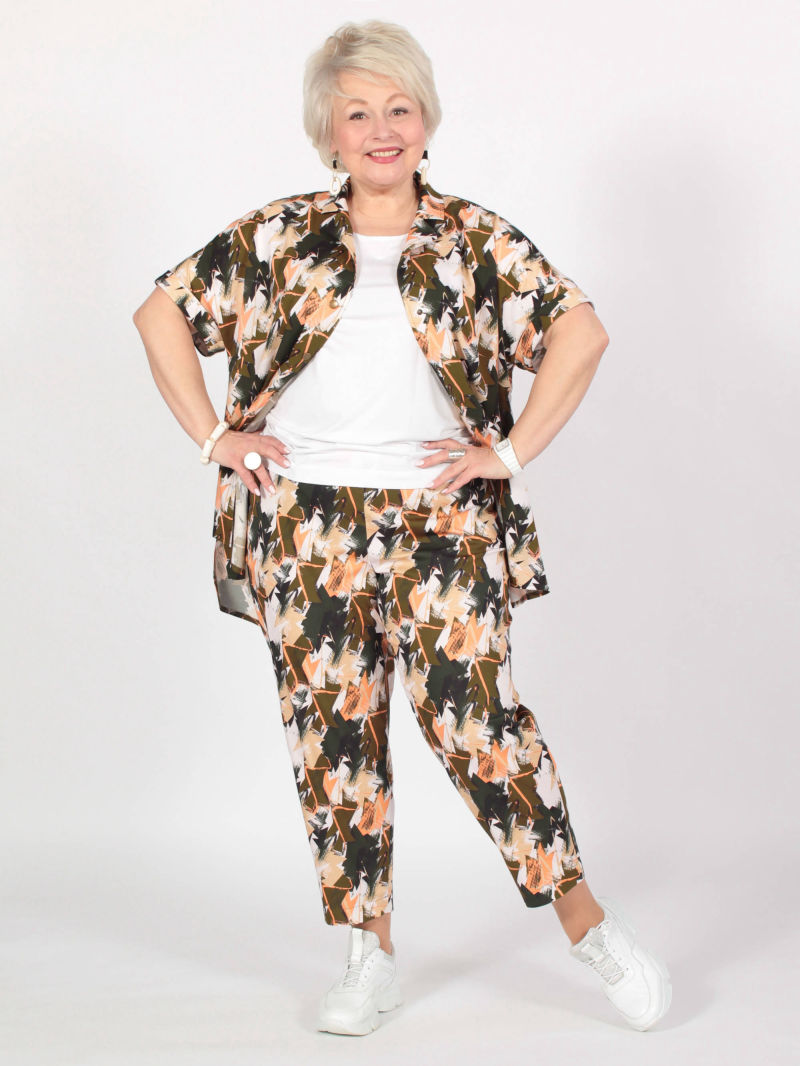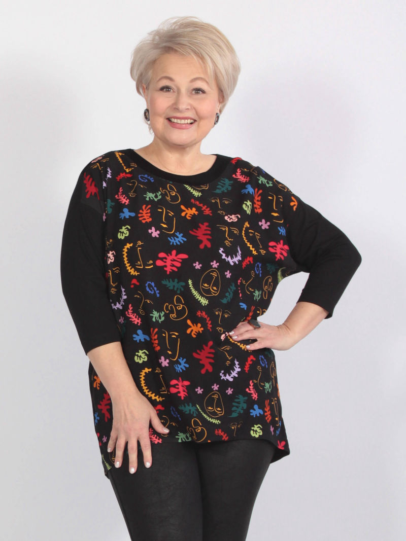 Идеальный принт это большая редкость. И нам пришлось потрудиться, чтобы найти такой для нашей туники. Блузка свободная, удлиненная, со спущенным плечом и оригинальным вырезом горловины. Рукава объёмные, на резинке, есть разрезы по боковым швам. Для создания образа могут подойти такие модели брюк: арт. 21367288, арт. 65086098, арт. 67000755, арт. 41266718, арт. 70459436
