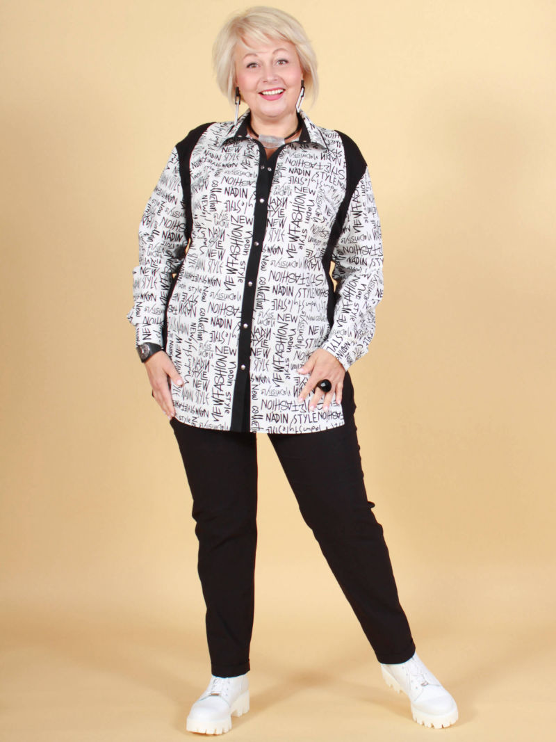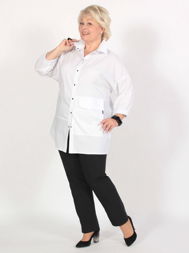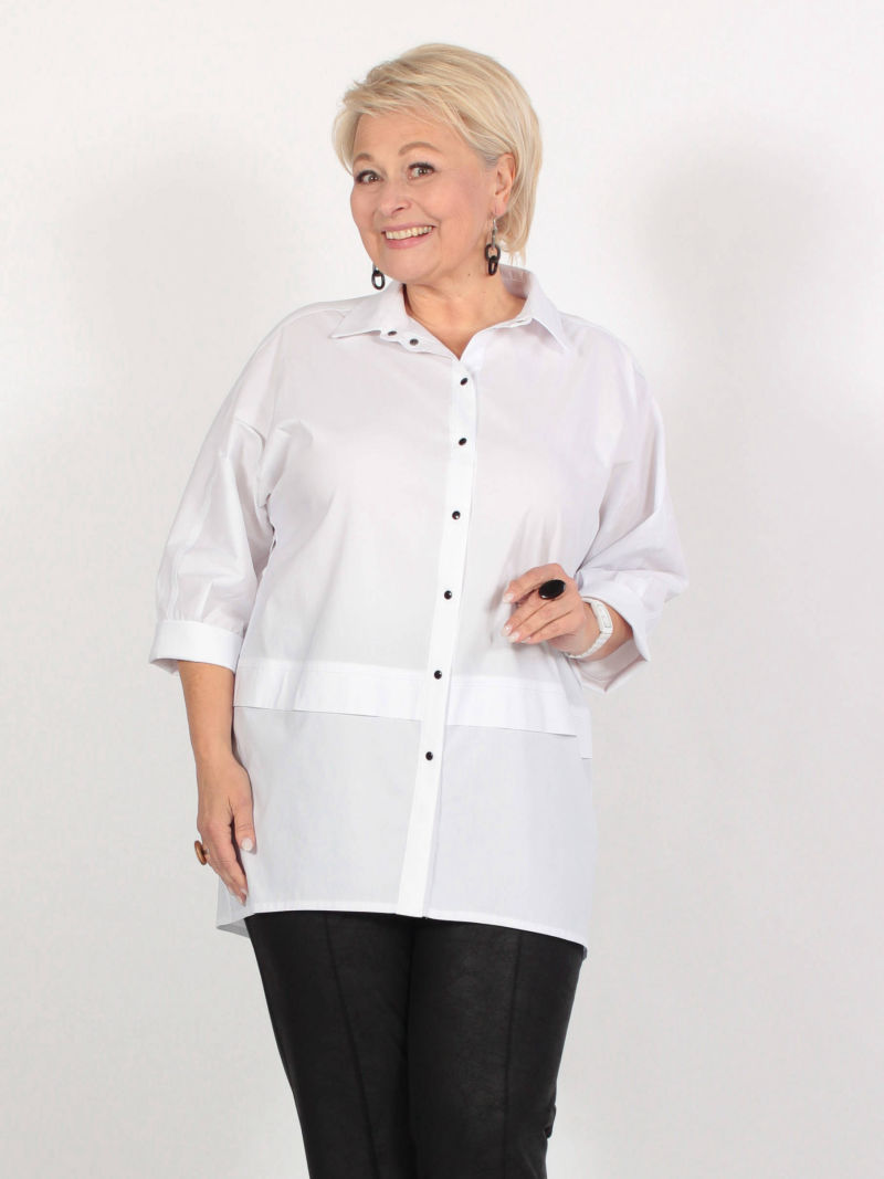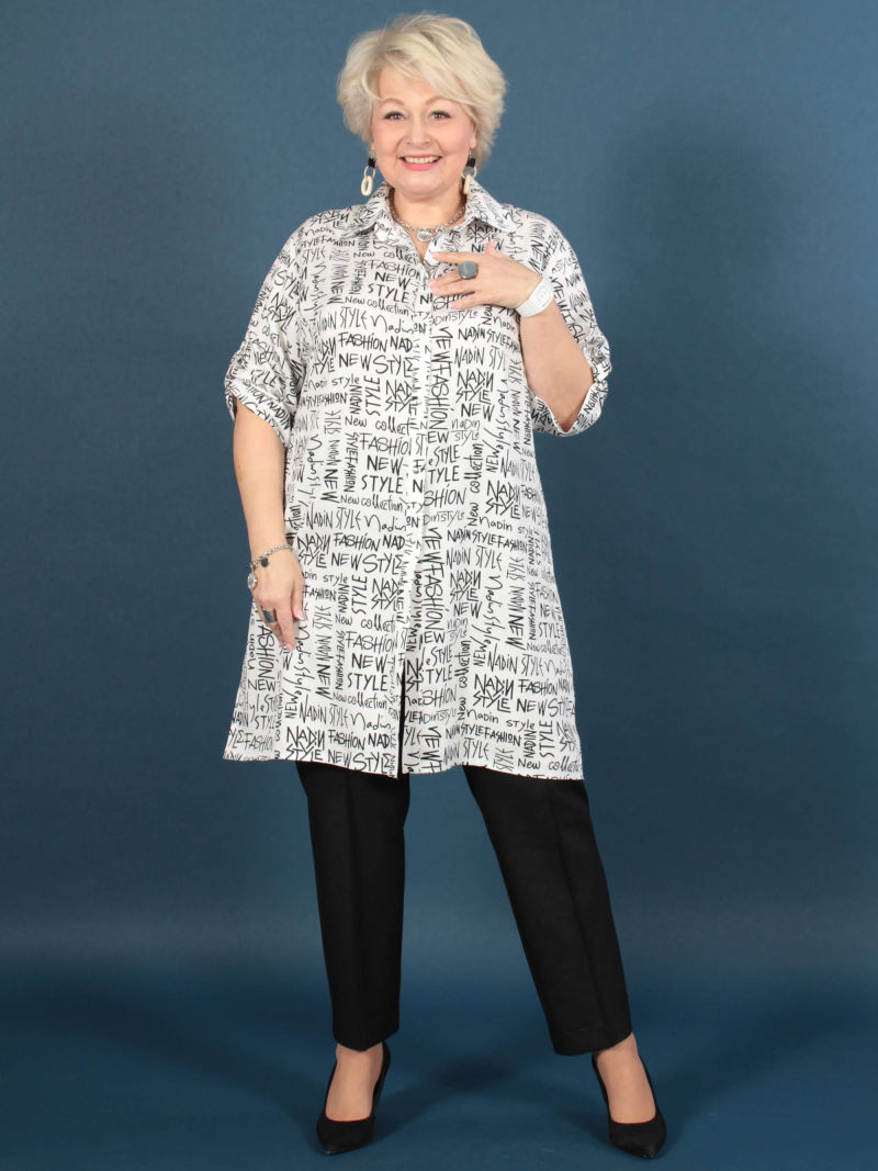 Длина блузки по спинке 80 см. Параметры наших моделей: блондинки - 56р, 112-94-120; брюнетки - 52р, 104-85-112. Модная туника из эластичного текстиля. Её можно носить как рубашку на голое тело, либо накинуть вместо лёгкого жакета. Поистине многофункциональная универсальная вещица. Оригинальность образу придает свободный покрой, складка в рельефном шве и фигурный низ. Рукав 7/8. Параметры наших моделей: блондинки - 56р, 112-94-120; брюнетки - 52р, 104-85-112. Plus size/плюс сайз/большие размеры/для полных женщин/надин оверсайз для девушек/белорусская одежда женская/Беларусь/офисное женское Белоруссия/oversize/турецкая ткань/удлиненный/джемпер/кофта/лонгслив/блузка удлиненная белая/брючный костюм/двойка/для подростка школа/для девочки школьная/спортивный.