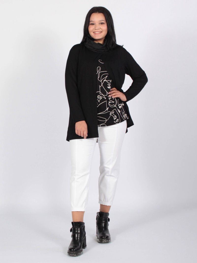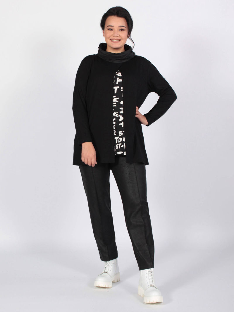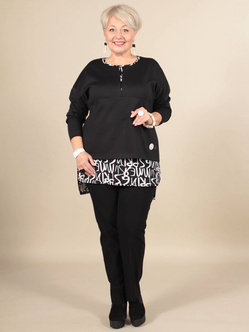 Оригинальная туника из вискозного трикотажа и хлопкового текстиля, имитирующая двойку: укороченную тунику и блузку. Верхняя туника - с фигурным вырезом горловины и высокими разрезами по боковым швам. Низ нижней блузки - фигурной формы, разноуровневый. Рукав длинный. Туника декорирована стильными логотипами.