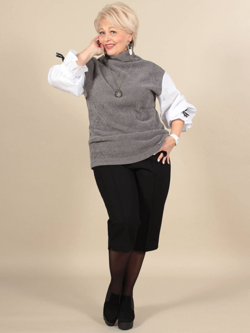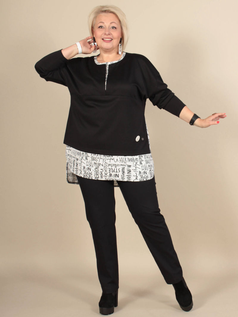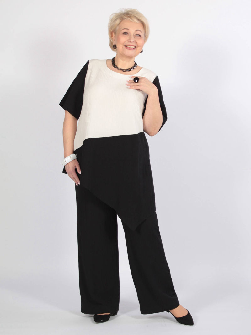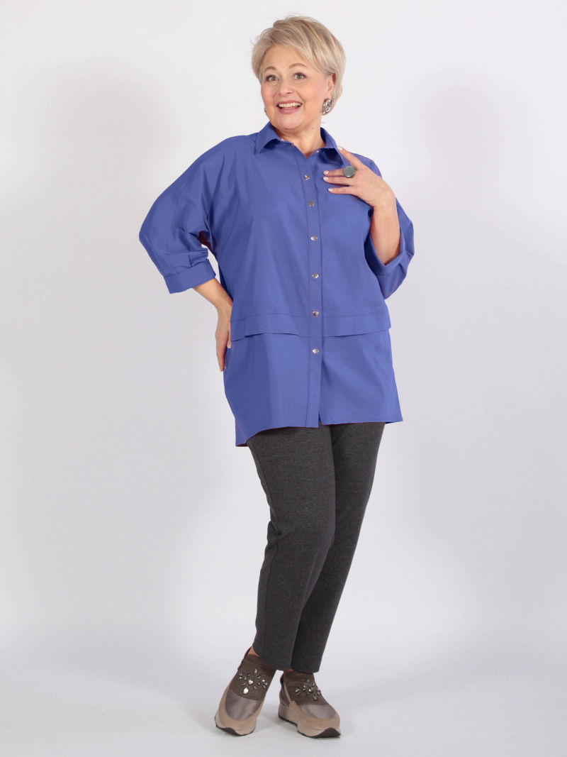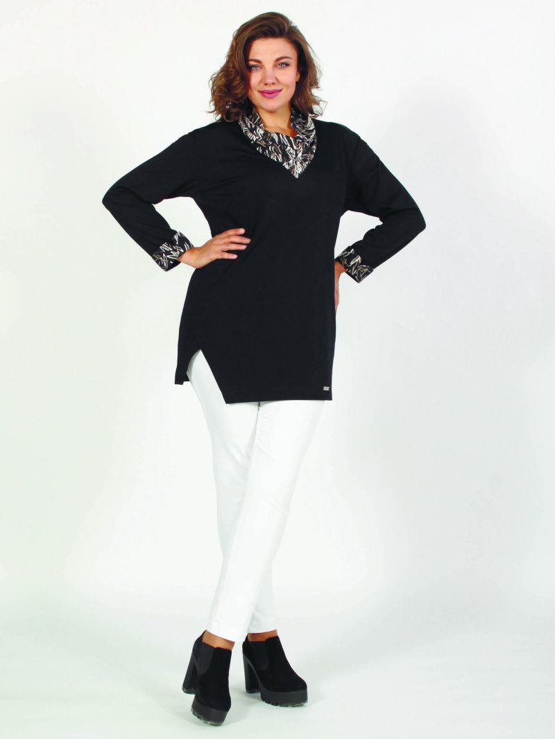 Многослойность в одежде используется давно. Её любят те, кто хочет уйти от стереотипов и выразить свою индивидуальность. Мы предлагаем своё решение: имитация двойки ( укороченная туника и блузка). Верхняя туника сшита из трикотажа, а нижняя часть блузки из хлопкового текстиля. Рукав у туники длинный, спущенное плечо. Горловина фигурной формы. Низ блузки тоже фигурный, разноуровневый, с высокими боковыми разрезами. Модель раньше продавалась под артикулом 10215458, отзывы можно посмотреть там. Для создания образа могут подойти такие модели: брюки арт. 39629566, арт. 17606417, арт. 38519281, арт. 37674699, арт. 33563943