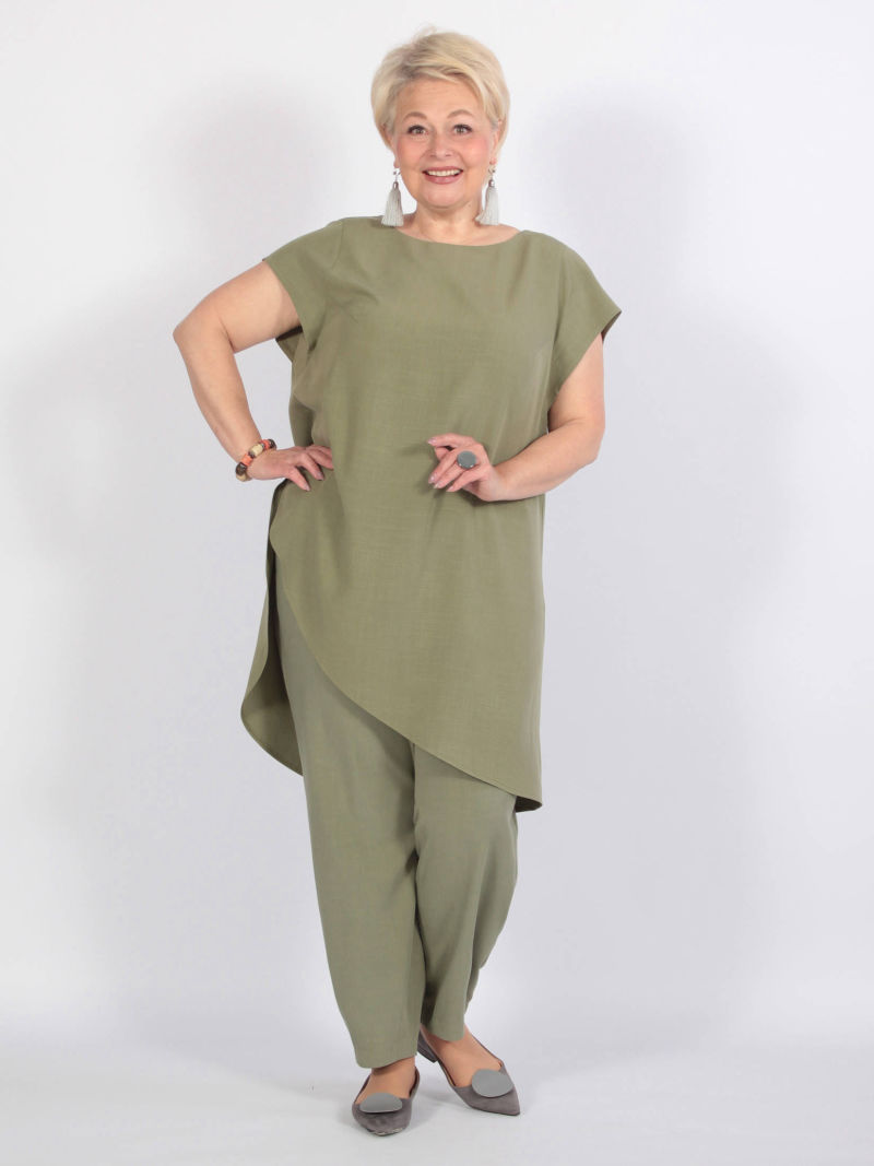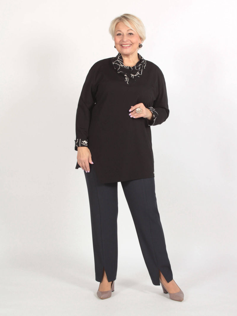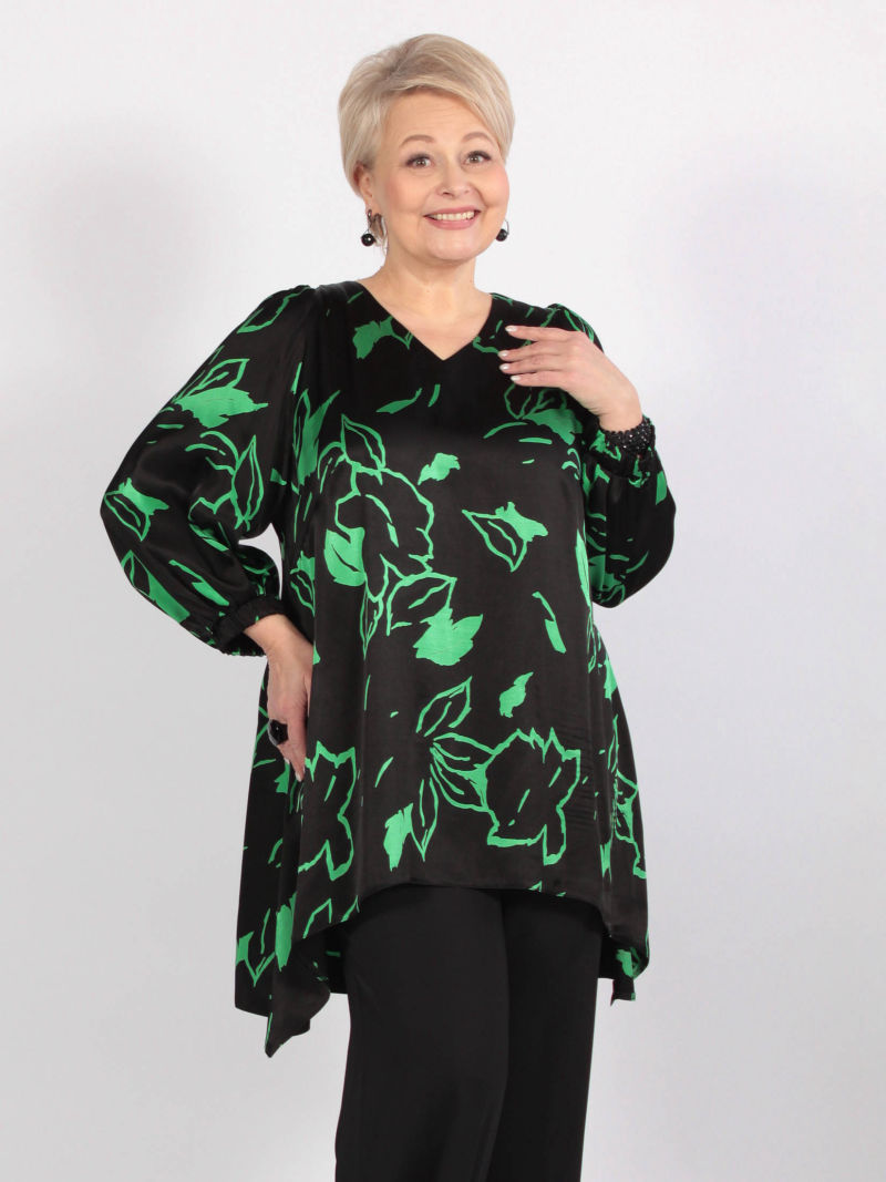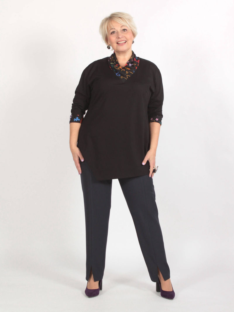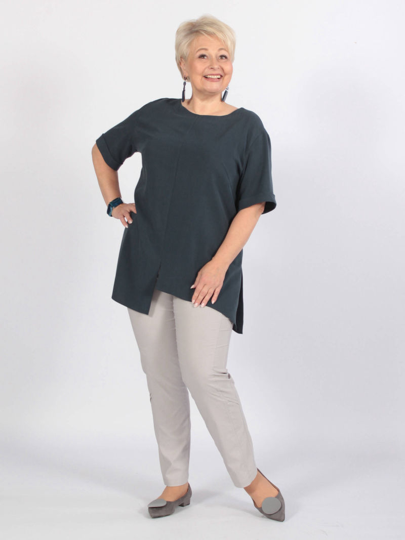 Туника А-силуэта с асимметричным низом. Блузка свободная, линия низа спереди изогнутая. Плечи заужены, чтобы зрительно уменьшить фигуру. При этом рукава достаточно широкие, что делает модную блузку комфортной. Треугольный вырез горловины тоже делает силуэт более вытянутым, стройным. Тунику можно носить с брюками или юбкой, хорошо смотрится она и с пояском. Для создания образа могут подойти такие модели брюк: арт. 69170141, арт. 70723505, арт. 67000755, арт. 20973907
