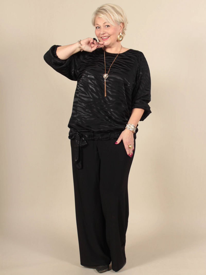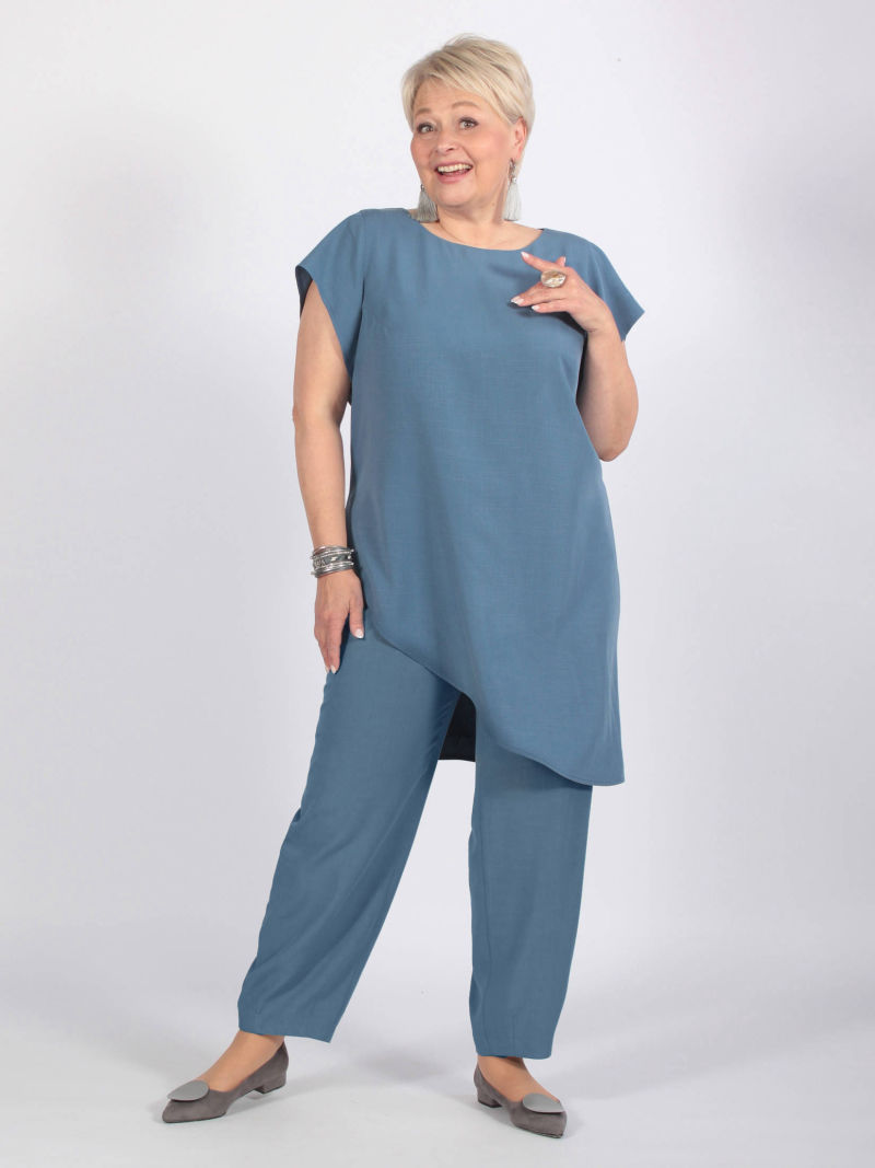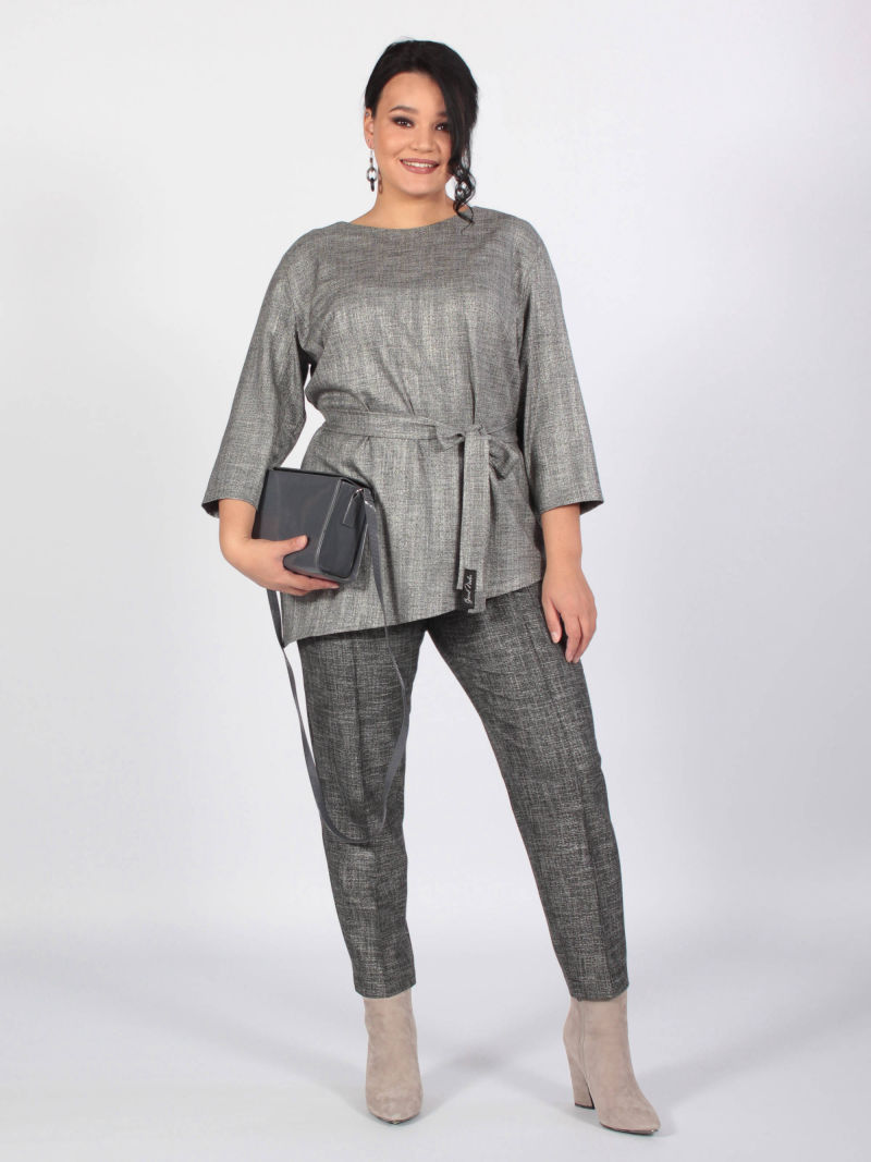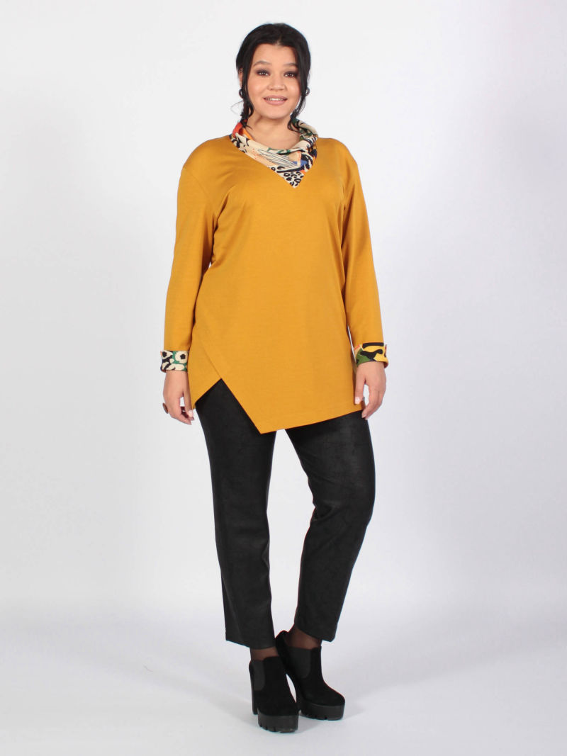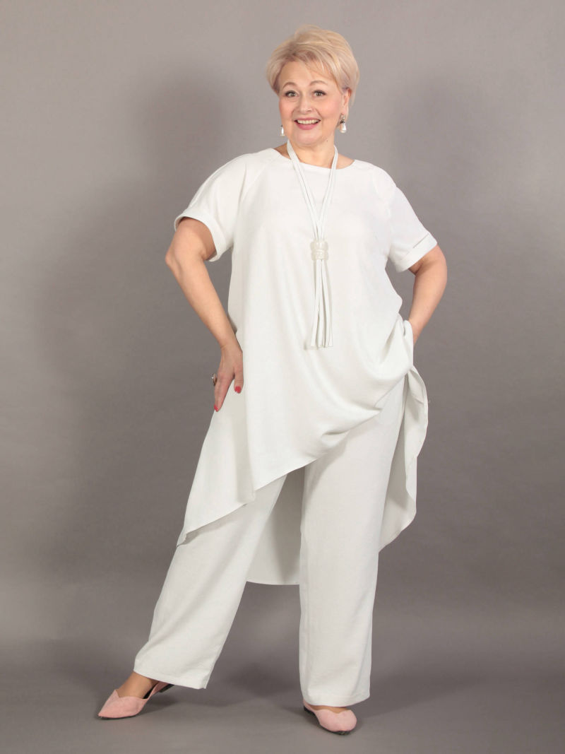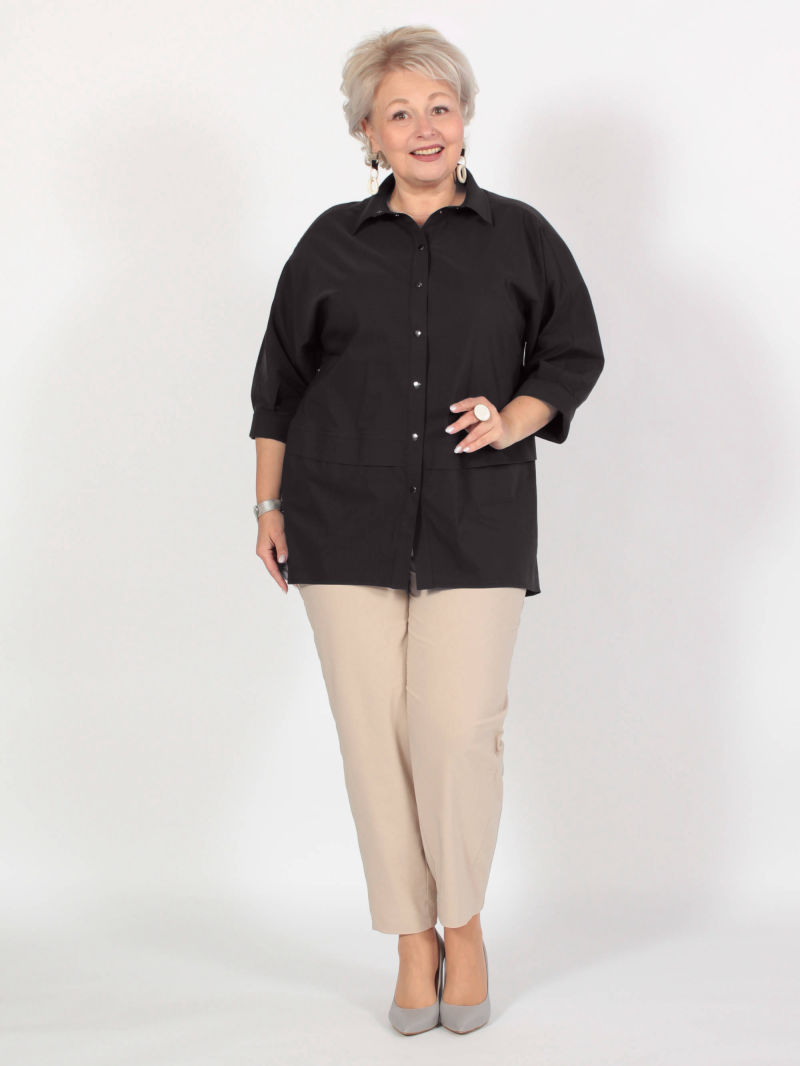 Туника А-силуэта с асимметричным низом. Блузка свободная, линия низа спереди изогнутая. Плечи заужены, чтобы зрительно уменьшить фигуру. При этом рукава достаточно широкие, что делает модную блузку комфортной. Треугольный вырез горловины тоже делает силуэт более вытянутым, стройным. Тунику можно носить с брюками или юбкой, хорошо смотрится она и с пояском. Для создания образа могут подойти такие модели брюк: арт. 69170141, арт. 70723505, арт. 67000755, арт. 20973907