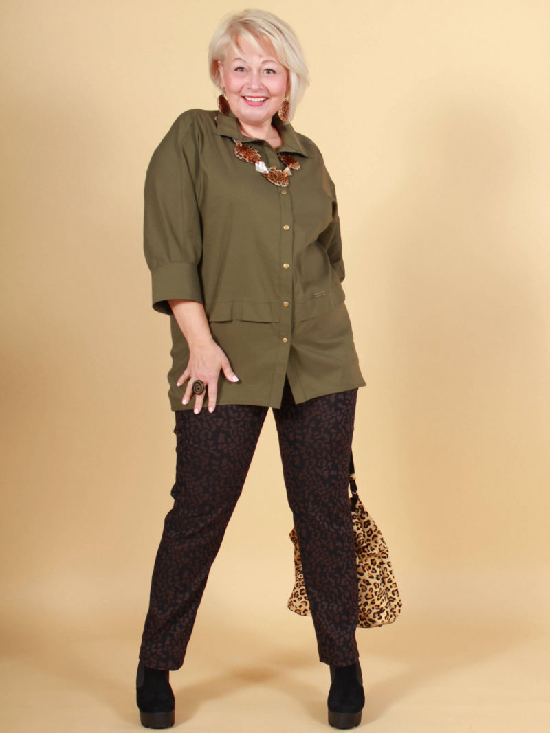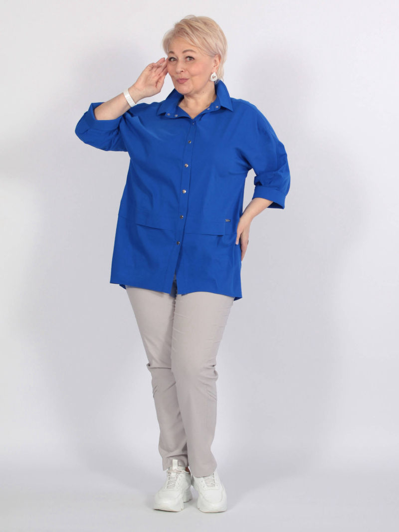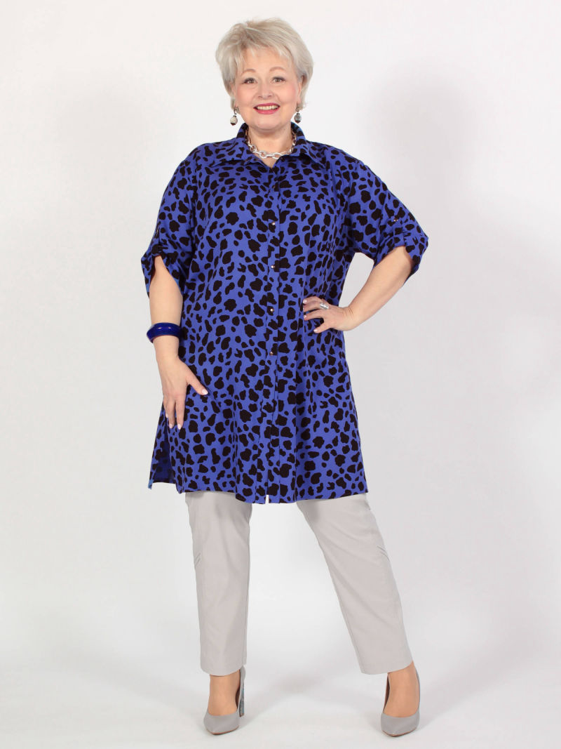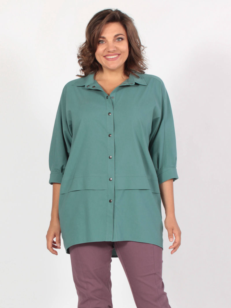 Мы хотели сделать блузку, похожую на облегчённый летний жакет. Туника из 100% вискозы, без эластана, поэтому она сделана достаточно свободной. У блузки спущенное плечо, воротник с лацканом, отрезные двойные манжеты и разрезы по бокам. Удобная застежка на кнопки.Если вы выберете размер по нашей размерной сетке ( она размещена на фото), то блузка будет на вас сидеть так же, как на нашей манекенщице.Для создания образа могут подойти такие модели: брюки арт. 32785799, арт. 76955745, арт. 25579901, арт. 74266433