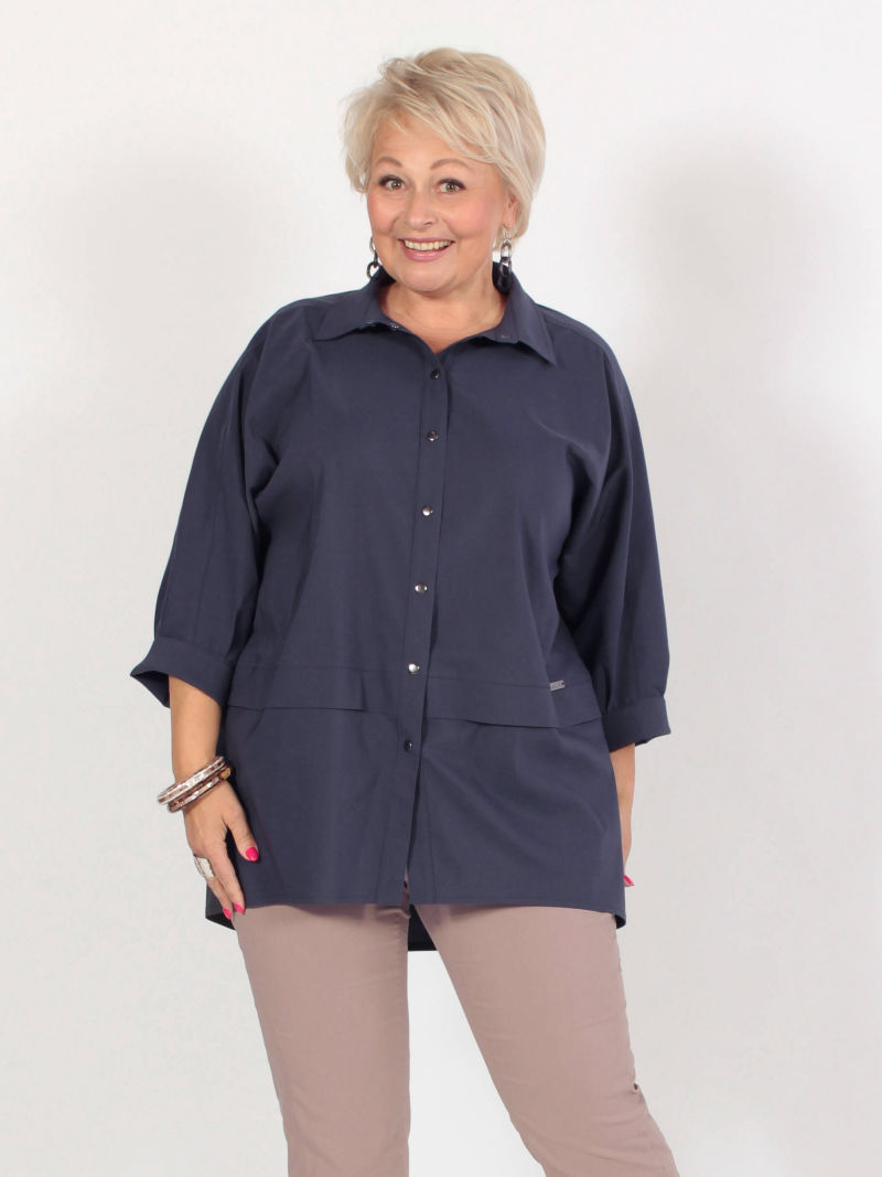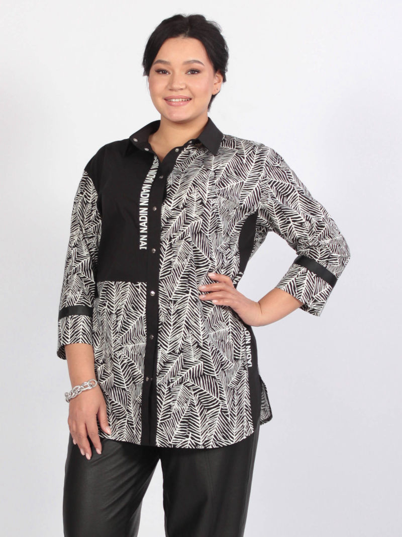 Стильная, модная, современная рубашка из трендового дизайна. Ткань текстильная с эластаном. Рубашка прямого силуэта, плечо спущено, укороченные рукава. Выигрышно смотрится за счет правильно расставленных акцентов на переде. Рукав 7/8 длины. Застежка на кнопки.
