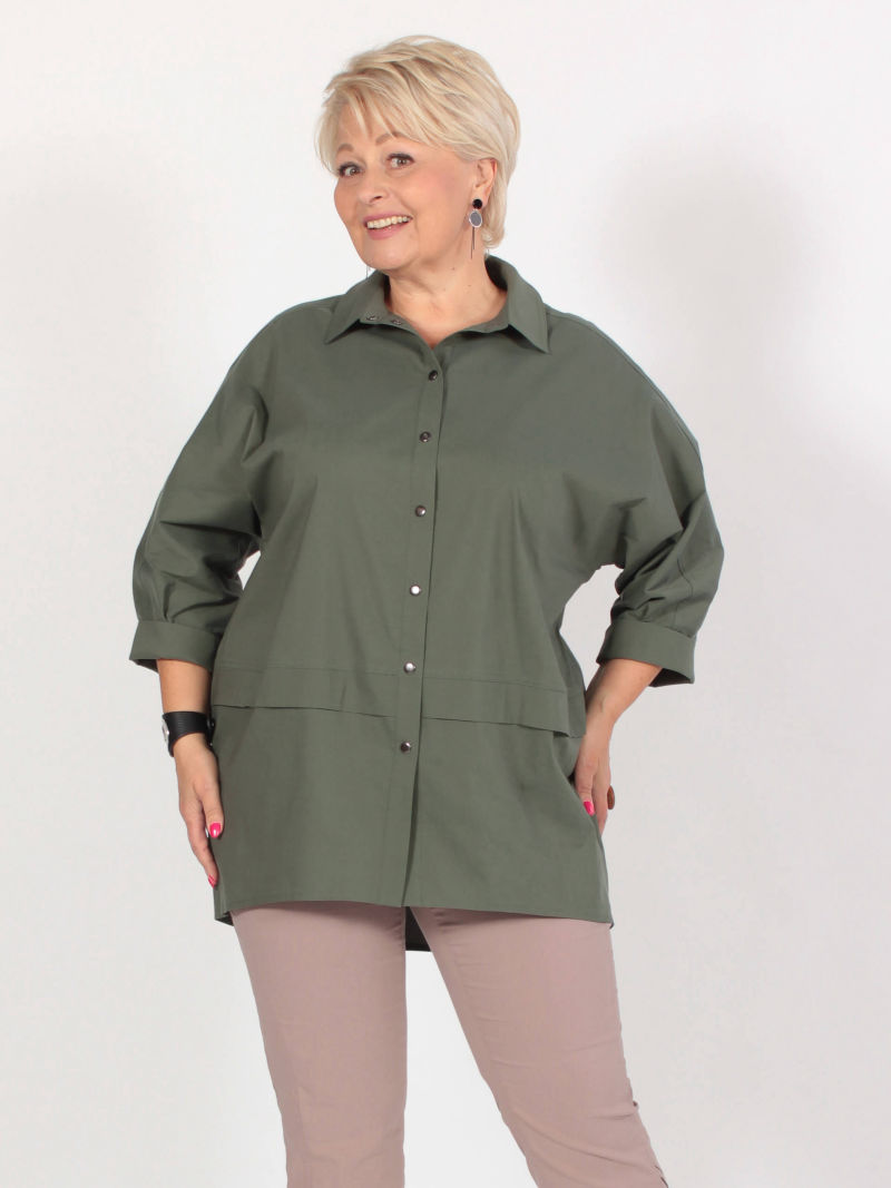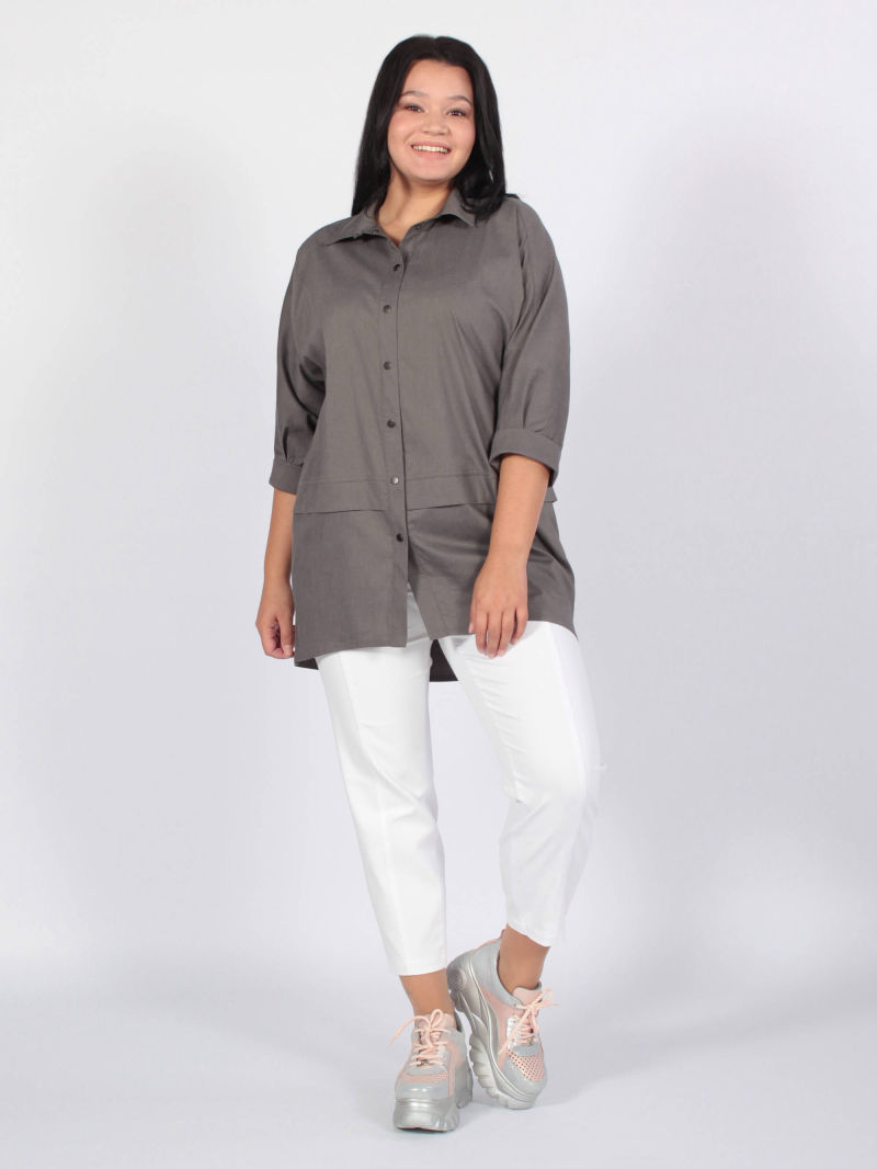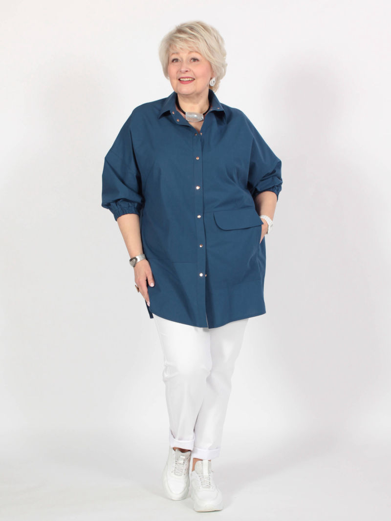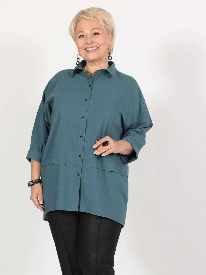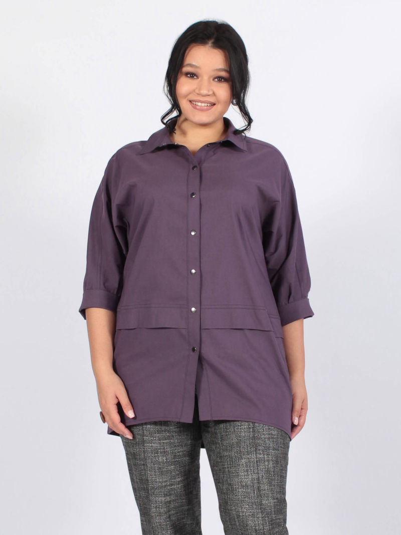 Туника в стиле оверсайз. Удобство и комфорт обусловлены за счет ткани и формы самого изделия. Спущенное плечо и обьемный рукав длиной 7/8. Низ рукава зафиксирован на манжете с эластичной резинкой. Застежка - планка на контрастных кнопках. Асимметричные подрезы и один большой карман с клапаном по переду. Просто, лаконично, модно. /блузка женская/ рубашка женская оверсайз/кофта женская/рубашка женская/майка женская/блузка женская офисный стиль/ Для создания образа могут подойти такие модели: брюки арт. 79645513, арт. 67000755, арт. 27433454, арт. 77451674