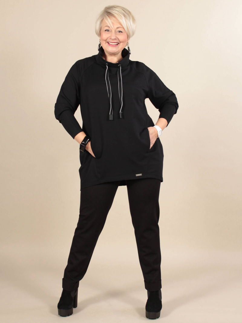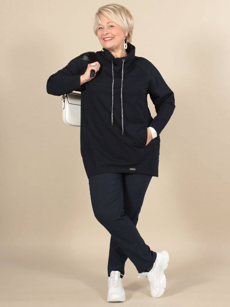 Свитшот из очень популярного сейчас трикотажа, типа футер. Футер -это двухсторонняя ткань, одна сторона которой гладкая, а другая - немного фактурная. Футер состоит из натуральных волокон, хорошо сохраняет тепло, держит форму, износоустойчив. Наша туника модного О-образного силуэта. В фигурных швах выполнены карманы. Удобный воротник-хомут декорирован люверсами и шнуром с наконечниками. Низ фигурной формы.