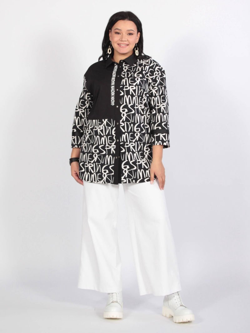 Стильная туника из эластичной хлопковой ткани. Рукава выполнены из трикотажной вискозы, что очень удобно в носке. Застежка на кнопки, стояче-отложной воротник выполнены из контрастной ткани. Черная планка как бы делит фигуру, зрительно уменьшая силуэт. Низ фигурной формы: перед закругленный, разрез спинки декорирован тесьмой с логотипом.