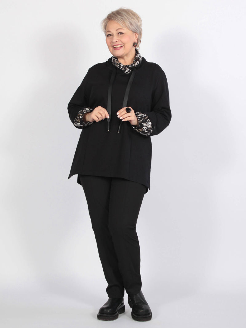 Туника свободной формы с элементами спортивного стиля. Туника сшита из трикотажа типа футер, а по рукаву и воротнику для отделки применен штапель. У нашего джемпера спущенное плечо, низ рукава припосажен на резинку, горловина выполнена в виде капюшона-обманки. Воротник дополнен декоративными шнурами. Дизайн и расцветка штапеля гармонично сочетается со шнурами. По боковым швам имеются небольшие разрезы. plus size/плюс сайз/большие размеры/для полных женщин/надин оверсайз для девушек/беларусская одежда женская/Беларусь/офисное женское деловое/Белоруссия/кофта/худи/туника удлиненная/блузка/рубашка/байка/брюки.