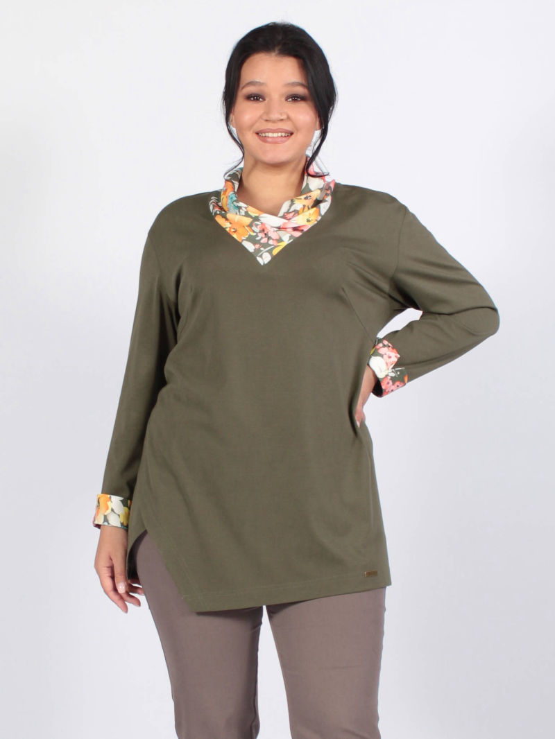 Туника из комбинированных тканей. Основная ткань - тонкая приятная трикотажная вискоза. Внутри вставка из принтованного штапеля. Воротник - труба из тафты. А-силуэт, с втачными рукавами. Блуза подойдет на все случаи жизни. Plus size/плюс сайз/большие размеры/для полных женщин/надин оверсайз для девушек/белорусская одежда женская/Беларусь/офисное женское/деловой стиль/джемпер/блузка/кофта/худи.