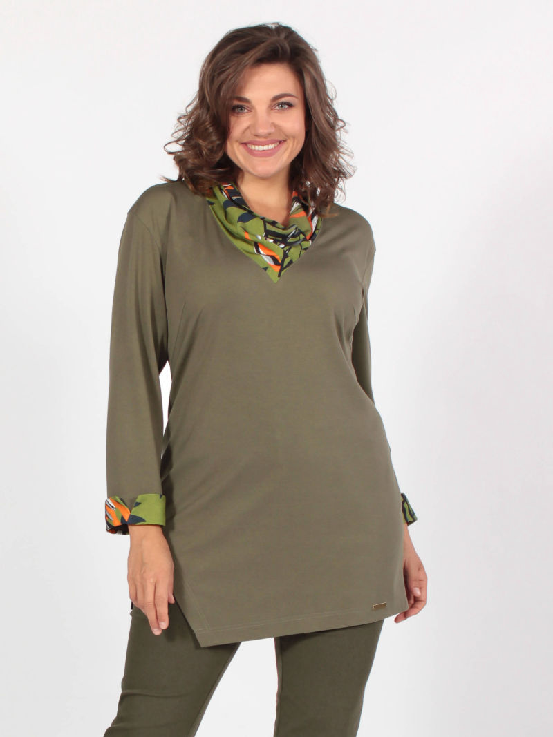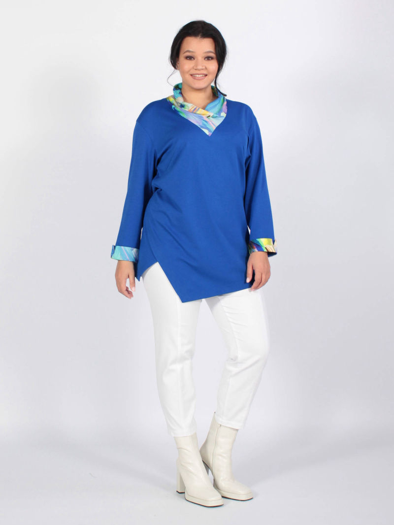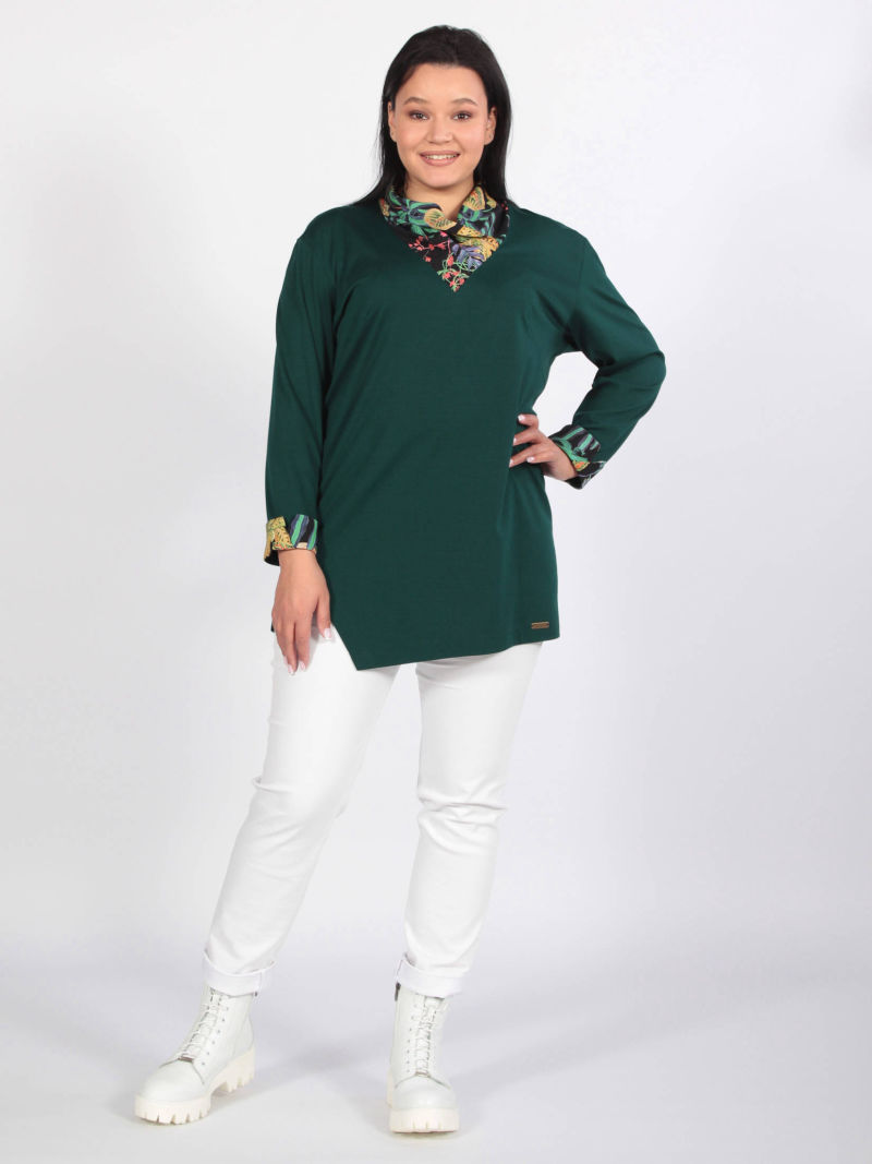 Комбинированная туника—джемпер с фигурным низом и трикотажными рукавами. Подобранные по цвету материалы: вискозный атлас со стилизованным абстрактным принтом и благородный трикотаж - гармонично сочетаются в нашей модели. Горловина округлой формы с притачной планкой из трикотажа. Слегка спущенная линия плеча создаёт мягкий обтекаемый силуэт изделия. Фигурный низ, спинка длиннее переда, подчеркнут тонкой полоской трикотажа. Для создания образа могут подойти такие модели: брюки арт. 99612777, арт. 102276119, арт. 98942699, арт. 97919093