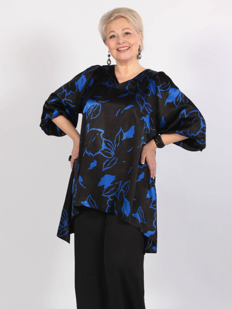 Длина изделия по спинке - 87см, длина рукава - 62см. Туника А-силуэта с асимметричным низом. Ткань для нашей блузки мы выбрали мягкую, пластичную и очень красивую. Внешне ткань похожа на шёлк или атлас, имеет характерный благородный отлив, по составу 100% вискоза. Блузка свободная, линия низа спереди изогнутая. Плечи заужены, чтобы зрительно уменьшить фигуру. При этом рукава достаточно широкие, что делает модную блузку комфортной. Треугольный вырез горловины тоже делает силуэт более вытянутым, стройным. Тунику можно носить с брюками или юбкой, хорошо смотрится она и с пояском.
