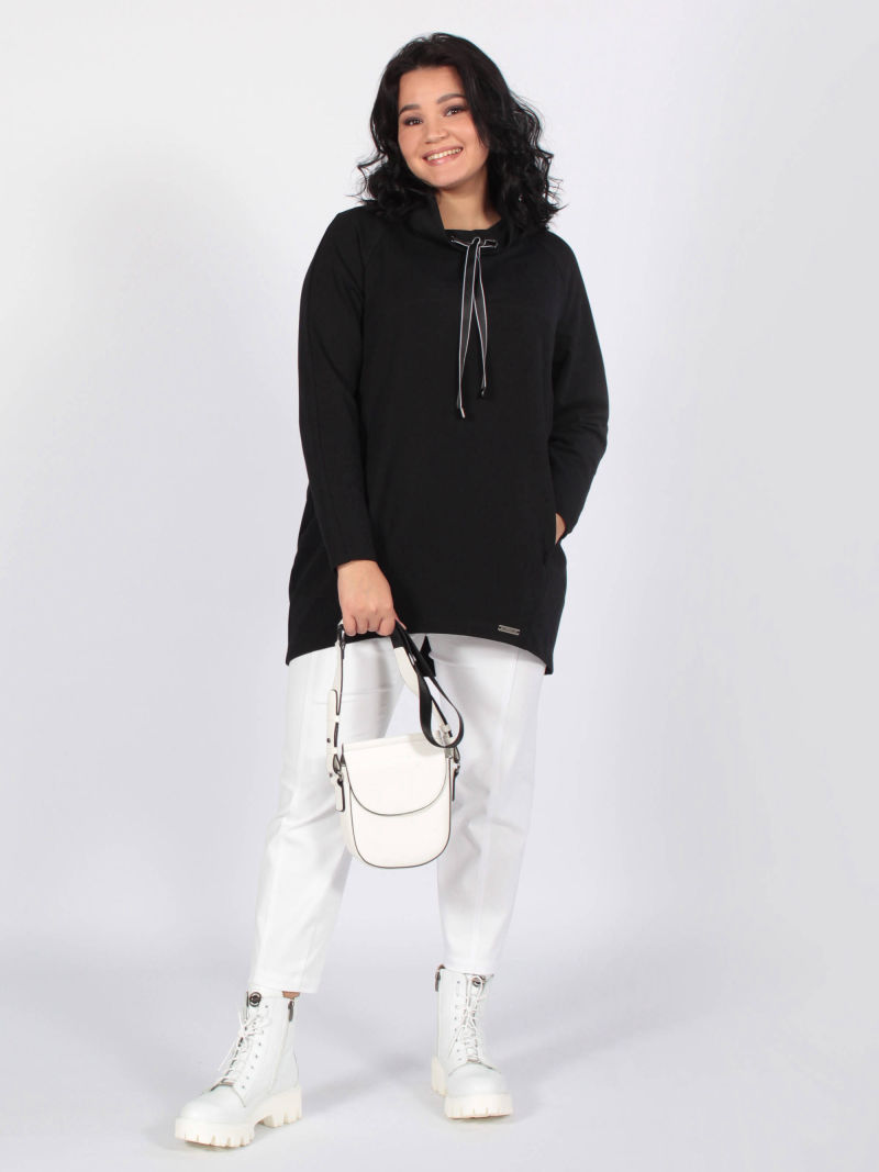 Свитшот из очень популярного сейчас трикотажа, типа футер. Футер состоит из натуральных волокон, хорошо сохраняет тепло, держит форму, износоустойчив. Наша туника модного О-образного силуэта. В фигурных швах выполнены карманы. Удобный воротник-хомут декорирован люверсами и шнуром с фирменными наконечниками. Низ джемпера фигурной формы. Для создания образа могут подойти такие модели: брюки женские арт. 90321153, арт. 67000755, арт. 102276119.