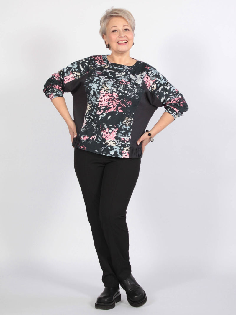 Длина изделия по спинке - 60см. Длина рукава внешняя - 60.2см. Надеемся, наша новая блузка понравится тем, кто любит попробовать что-то новое и оригинальное. Джемпер необычного кроя из двух тканей, разных по фактуре. Ткань с рисунком это трикотажный футер, а однотонные вставки сделаны из текстильного хлопка со стрейчем. Блуза получилась в меру свободная, по низу мы сделали резинку.