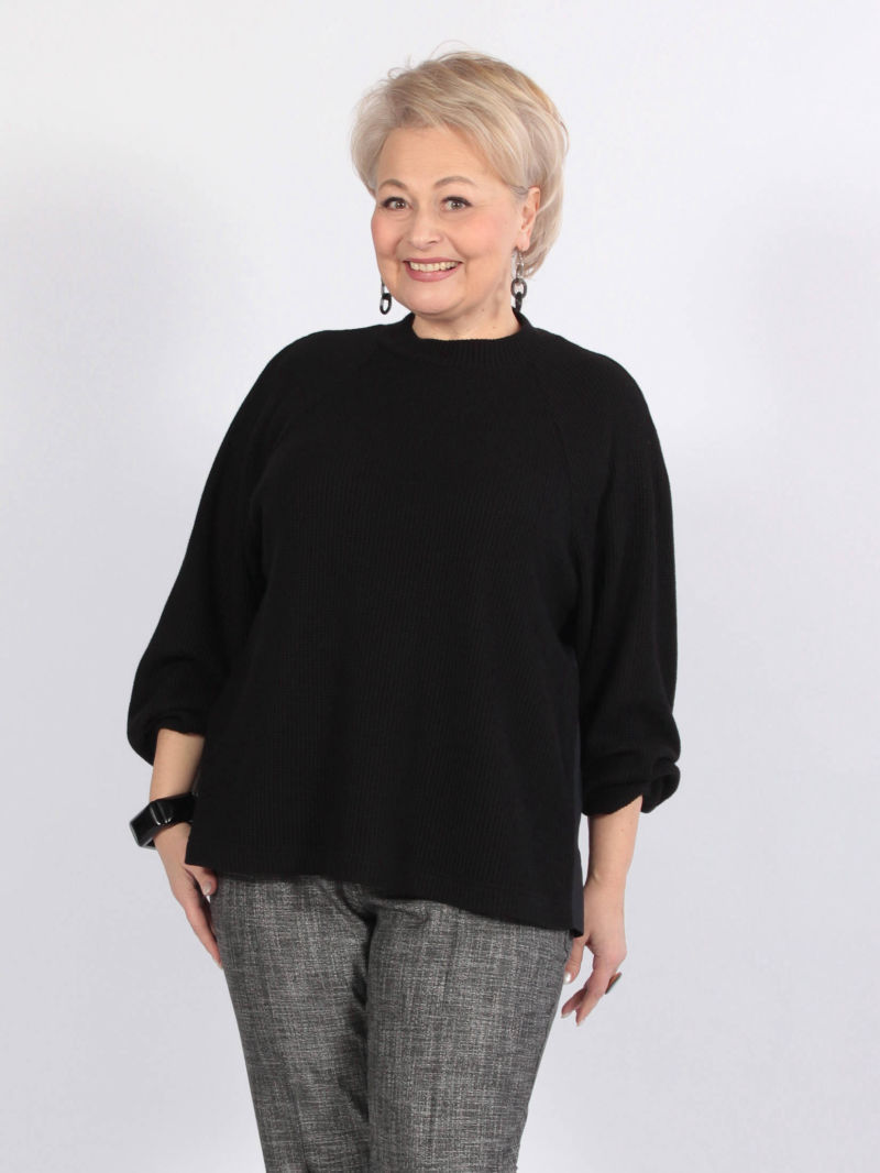 Длина изделия по спинке - 75 см, длина рукава - 72 см. Лаконичный джемпер из мягкого, пластичного трикотажа. Воротник и манжеты выполнены из штапеля с приятным дизайном. Джемпер свободный, со спущенной линией плеча, низ изделия ассиметричный. Параметры наших моделей: блондинки - 54р, 108-89-116;брюнетки - 52р, 104-85-112.