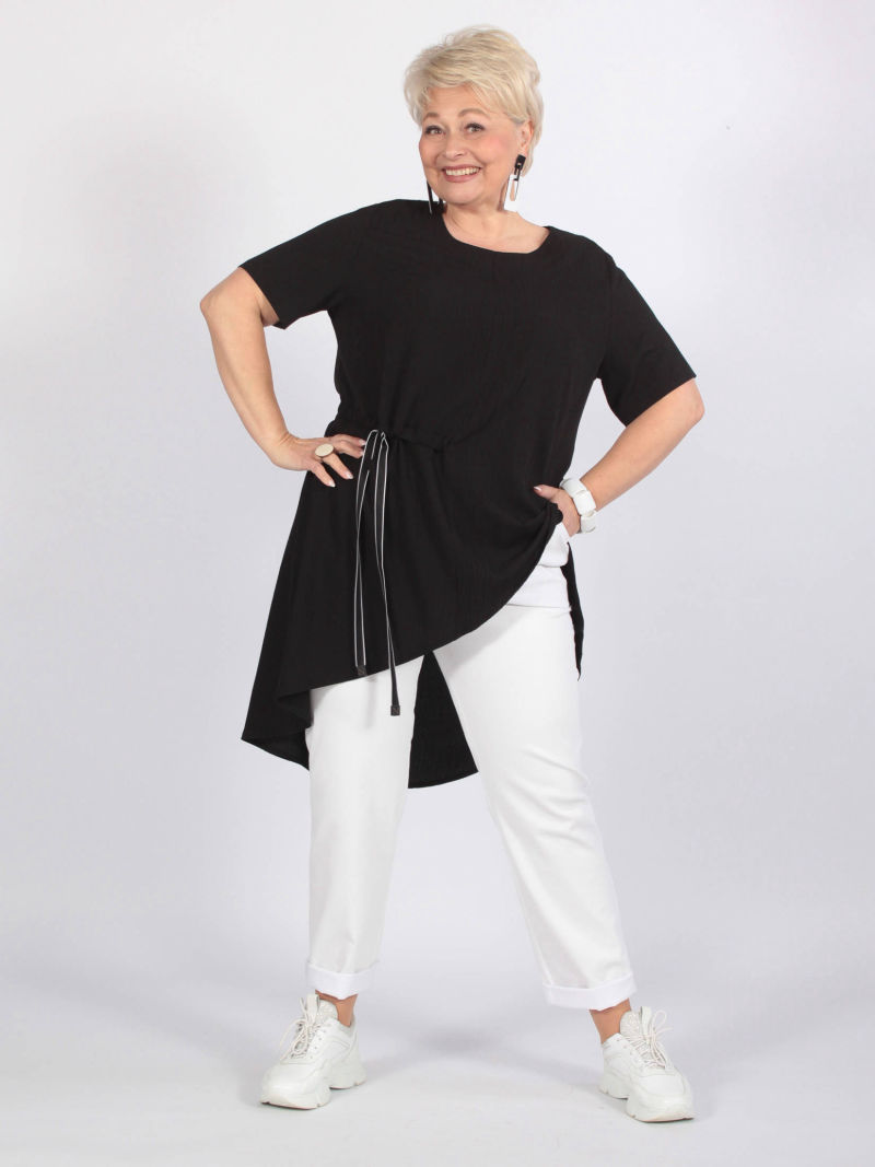 Асимметричная туника из приятной смесовой ткани с эластаном. Горловина округлой формы-лодочка, линия плеча слегка спущена. Рукав прямой длиной 3/4 зауженный к низу. Высокий разрез справа и косой низ изделия визуально стройнит и вытягивает фигуру. Туника дополнена отделочным пояском, декорированным фирменной лентой. Для создания образа могут подойти такие модели: брюки арт. 99010537, арт. 77451674, арт. 98980673
