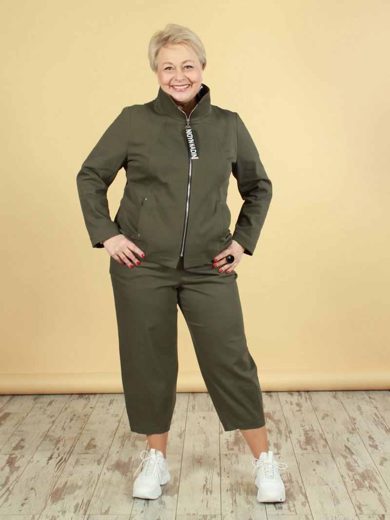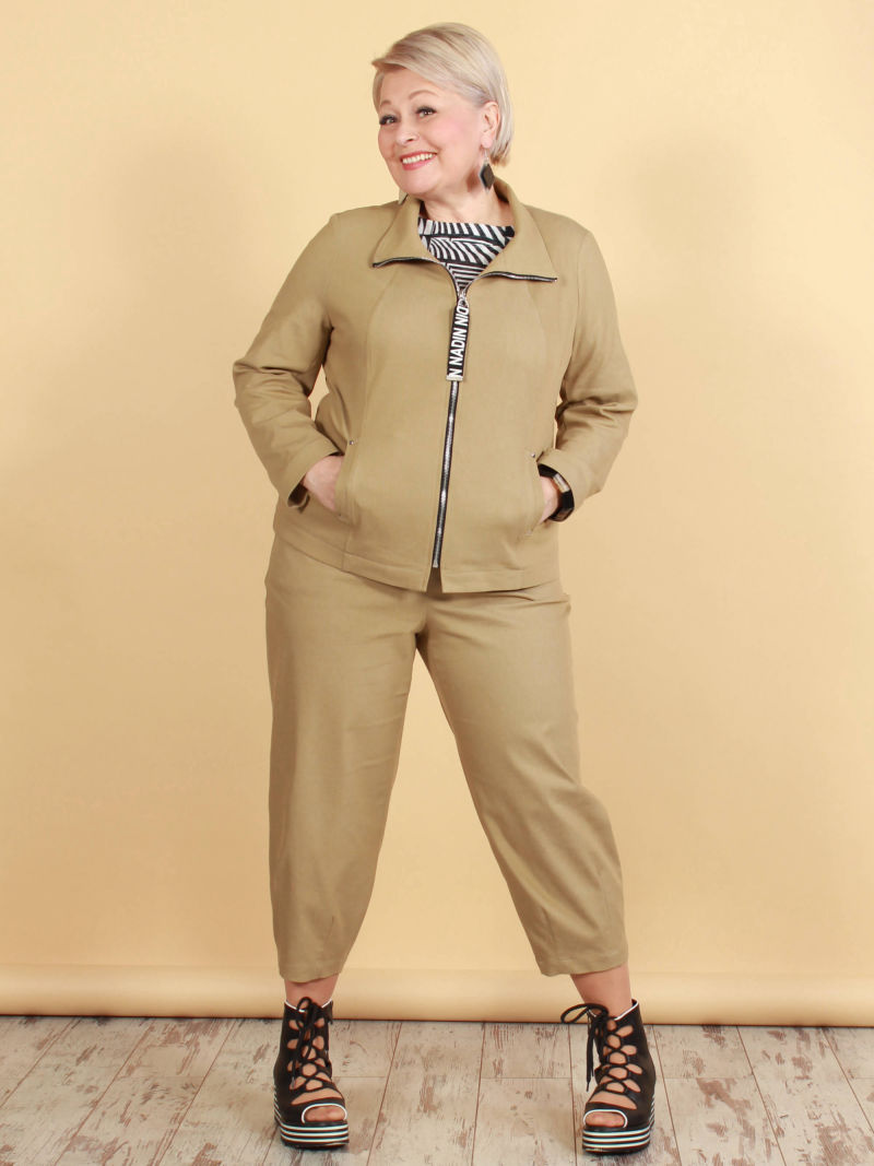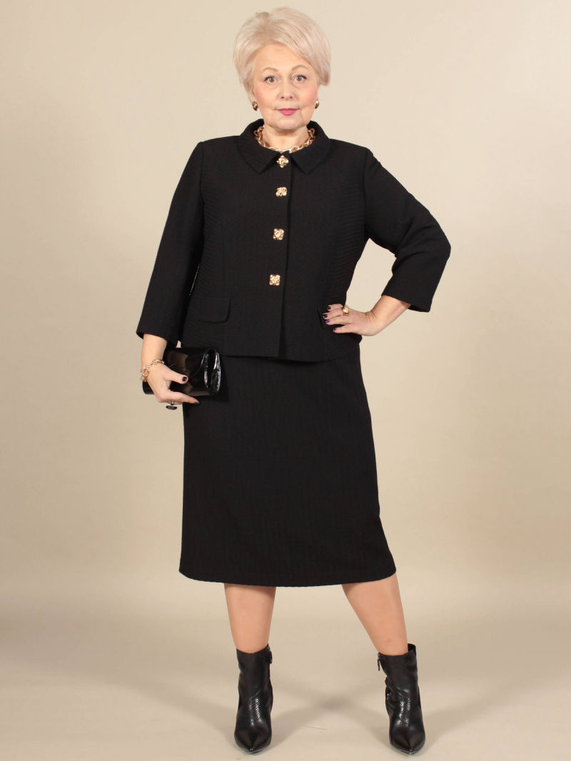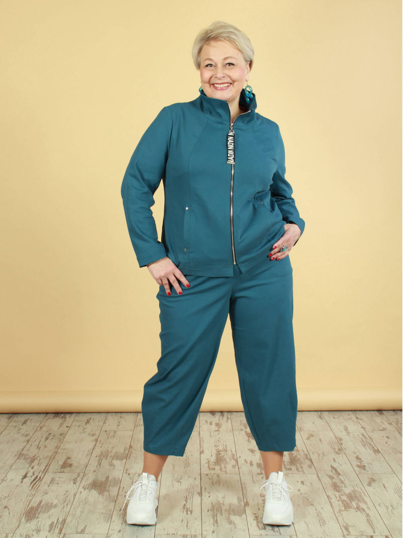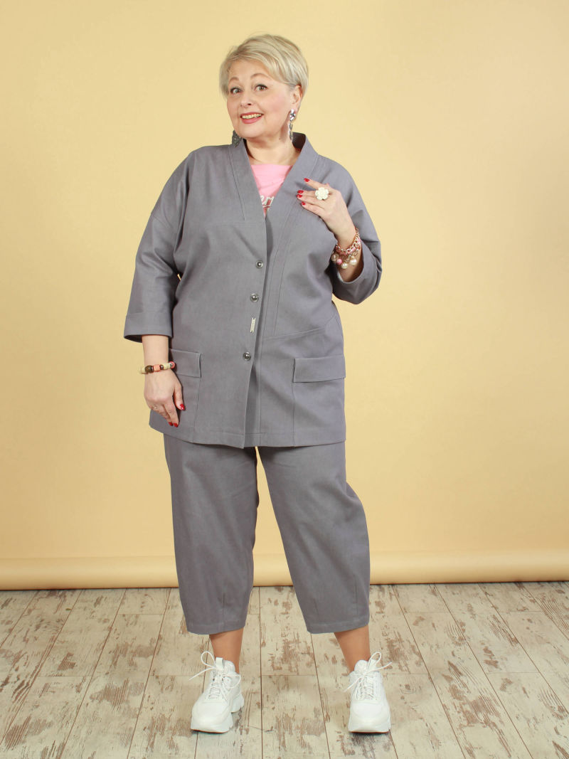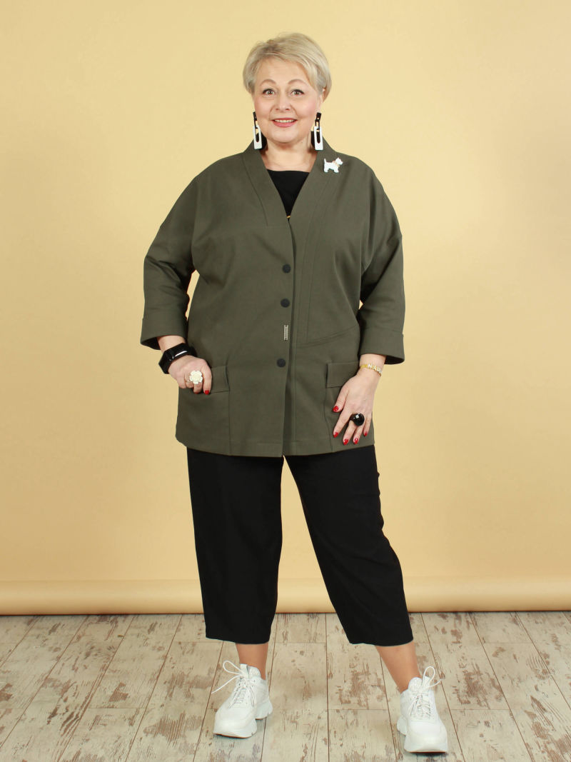 Укороченный жакет с рукавами 7/8. Мы сделали у нашего жакета воротник, который довольно широко отстоит от шеи, для того чтобы была открыта зона декольте с украшением. Перед жакета мы украсили декоративными клапанами и яркими пуговицами. Ткань жакета со стрейчем, красивая, фактурная, слегка объёмная, но при этом очень лёгкая, что немаловажно в изделиях с большим размером ( с большим расходом ткани соответственно) . Жакет можно носить на голое тело, с юбкой, например. Либо дополнить образ платьем из такой же ткани, артикул 49884615.
