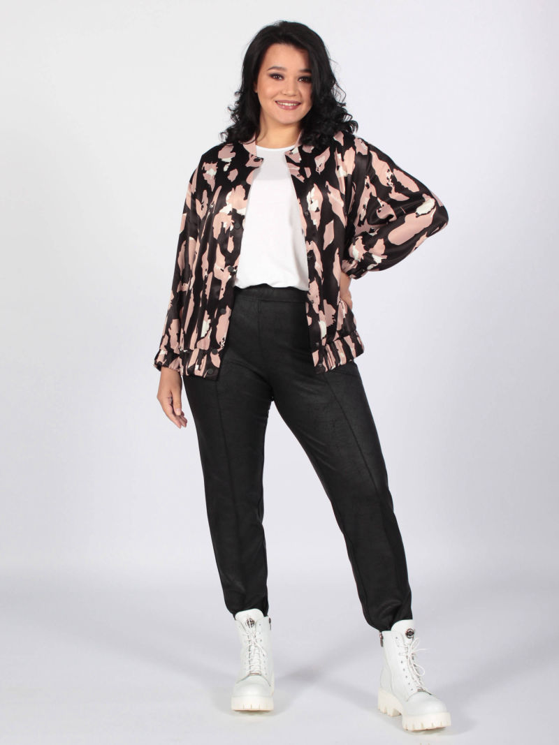 Жакет-бомбер из атласной вискозы с благородным блеском и оригинальным дизайном. Можно носить и на голое тело, как блузку. Линия плеча слегка спущена, рукав широкий длинный фиксируется по низу на резинку. Свободный крой изделия обеспечивает комфорт и не сковывает движения. Горловина декорирована стойкой из мягкого трикотажа в цвет ткани. Застежка на кнопки. Низ изделия оформлен широким притачным пояском с эластичной резинкой внутри. Для создания образа могут подойти такие модели: брюки женские арт. 70459436, арт. 128720791, арт. 102276119.
