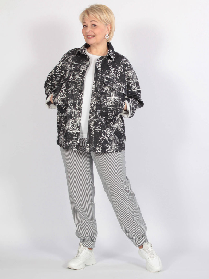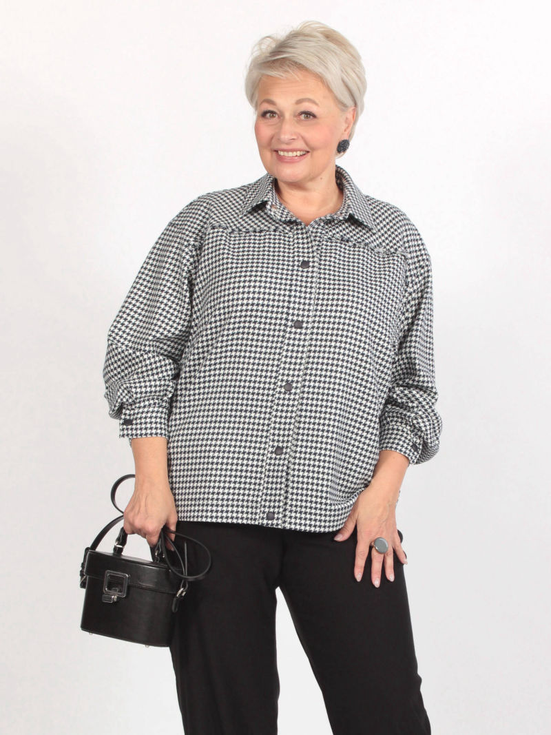 Длина изделия по спинке - 65 см, длина рукава с плечом - 76 см. Стильный жакет-бомбер вдохновлен стилем Коко Шанель и изготовлен из мягкой бело-синей смесовой ткани в классическом узоре "гусиная лапка". Этот жакет обладает неповторимым шармом и элегантностью. Легкая спущенная линия плеча придает жакету обтекаемую и уютную форму. Рукав полной длины украшен притачной манжетой и застегивается на кнопку для дополнительного комфорта. Классический стоячий воротник делает его дизайн утонченным и элегантным. Центральная застежка на кнопки в цвет материала придает жакету завершенный вид. Модель также декорирована кокеткой сзади и спереди, а также бахромой, что придает ей изысканный и женственный облик. Эта куртка прекрасно сочетается как с джинсами, так и с деловыми брюками или юбкой. Он добавит изысканности вашему образу, подчеркивая вашу индивидуальность и стиль. Он также подойдёт для беременных женщин. Жакет женский больших размеров полуприлегающего силуэта, длиной до линии бедер. вого, так и повседневного гардероба.